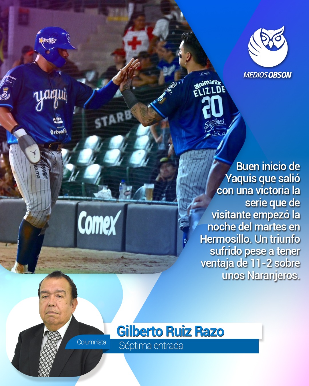 CON PINZAS.- Buen inicio de Yaquis que salió con una victoria la serie que de visitante empezó la noche del martes en Hermosillo. Un triunfo sufrido después de tener ventaja de 11-2 sobre unos Naranjeros que reaccionaron en grande, aunque al final se quedaron cortos. Veremos si tienen la oportunidad, la tribu, de agenciarse la serie.