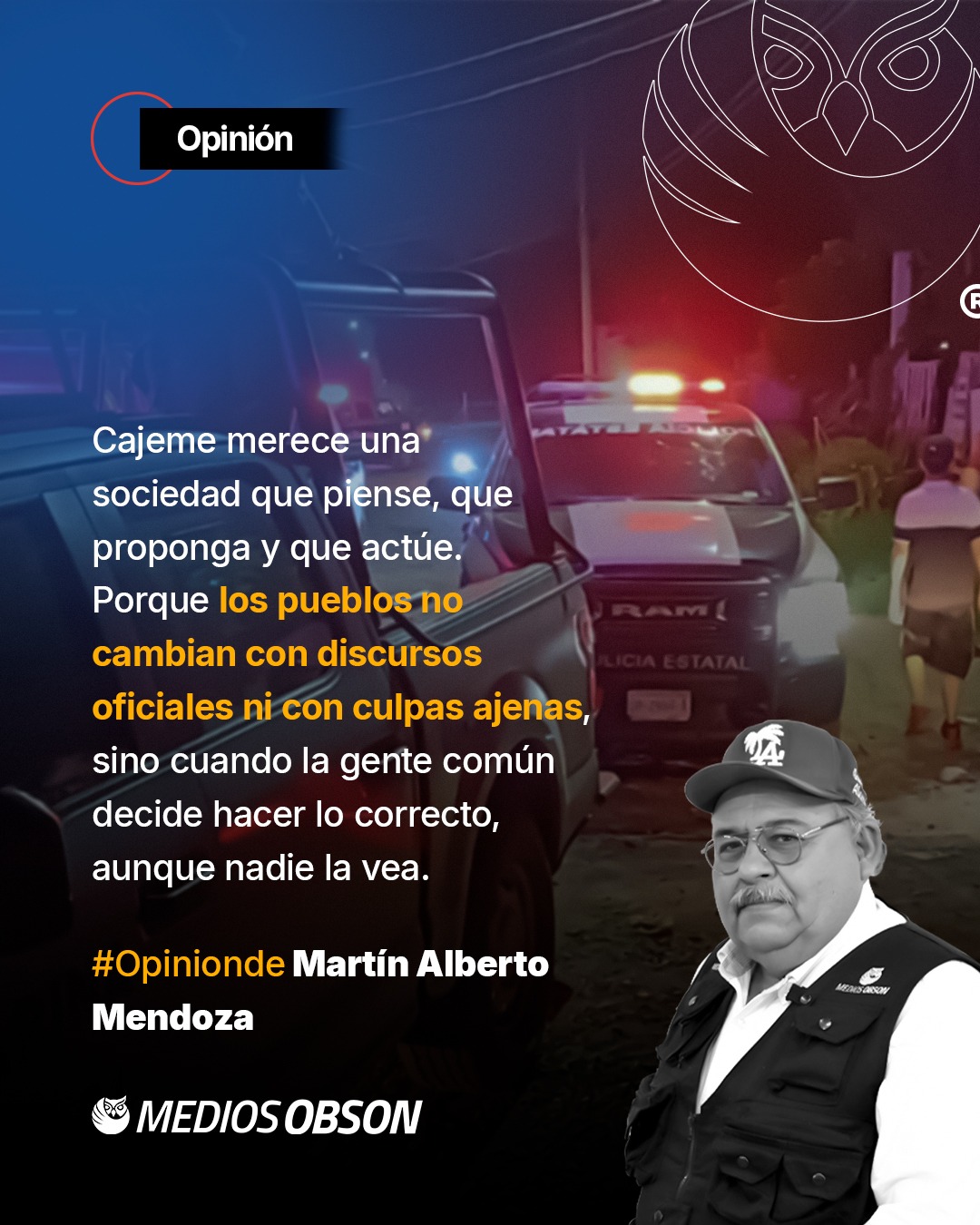 CAJEME NECESITA MENOS DISCURSOS Y MÁS VERDAD; ESTE MIÉRCOLES SUMARON CINCO DÍAS CON UN HOMICIDIO CADA VEINTICUATRO HORAS; MUNICIPIO NO NECESITA MÁS PALABRAS HUECAS NI LUCHAS DE PODER QUE SOLO DIVIDEN; REQUIERE ACCIONES QUE UNAN, VOCES QUE APORTEN Y MANOS DISPUESTAS A SERVIR SIN PROTAGONISMOS; SERÍA VALIOSO SUMAR A TODOS: MEDIOS DE COMUNICACIÓN, PENSIONADOS, PROFESIONISTAS, JÓVENES Y CIUDADANOS CON EXPERIENCIA; GENTE QUE HA VIVIDO Y CONOCE EL PALPITAR DE OBREGÓN, QUE AÚN TIENE MUCHO QUE ENSEÑAR. PERSONAS QUE, DESDE SU EXPERIENCIA, PUEDEN SEGUIR SIENDO ÚTILES, NO DESDE LA NOSTALGIA, SINO DE LA SABIDURÍA QUE DA HABER VISTO PASAR GENERACIONES Y ERRORES REPETIDOS; PODEMOS APOYARNOS UNOS A OTROS, SUMAR ESFUERZOS Y DEJAR ATRÁS ESOS DISCURSOS QUE SE VISTEN DE CIFRAS, PROMESAS Y ESTADÍSTICAS, CUANDO LA REALIDAD QUE SE VIVE Y SE PALPA CADA DÍA DICE OTRA COSA; ESTA CIUDAD MERECE UNA SOCIEDAD QUE PIENSE, QUE PROPONGA Y QUE ACTÚE. PORQUE PUEBLOS NO CAMBIAN CON ARENGAS OFICIALES NI CON CULPAS AJENAS, SINO CUANDO LA GENTE COMÚN DECIDE HACER LO CORRECTO, AUNQUE NADIE LA VEA; Y TAL VEZ AHÍ, EN ESE ACTO SILENCIOSO DE COMPROMISO, INICIE EL VERDADERO RENACER DE NUESTRA TIERRA; ACCIONA BRAZO DE LA JUSTICIA Y CAE PRESUNTO SICARIO LUEGO DE INTENSO DESPLIEGUE POLICÍACO MILITAR; FUE BAJADO DE LAS AZOTEAS DE DOMICILIOS DE LA COLONIA CORTINAS; TAMBIÉN ASEGURAN ARMA DE FUEGO QUE DETONÓ EN REPETIDAS VECES; PODRÍA ESTAR RELACIONADO CON ÚLTIMOS CRÍMENES REGISTRADOS AQUÍ; LAS PALABRAS QUE ACOSTUMBRAMOS USAR PARA DESCRIBIR LA VIDA DE LOS DEMÁS SE VUELVEN INSUFICIENTES CUANDO EL GOLPE DEL DESTINO TOCA A QUIEN LAS ESCRIBE; DESCANSE EN PAZ RAMÓN RUELAS