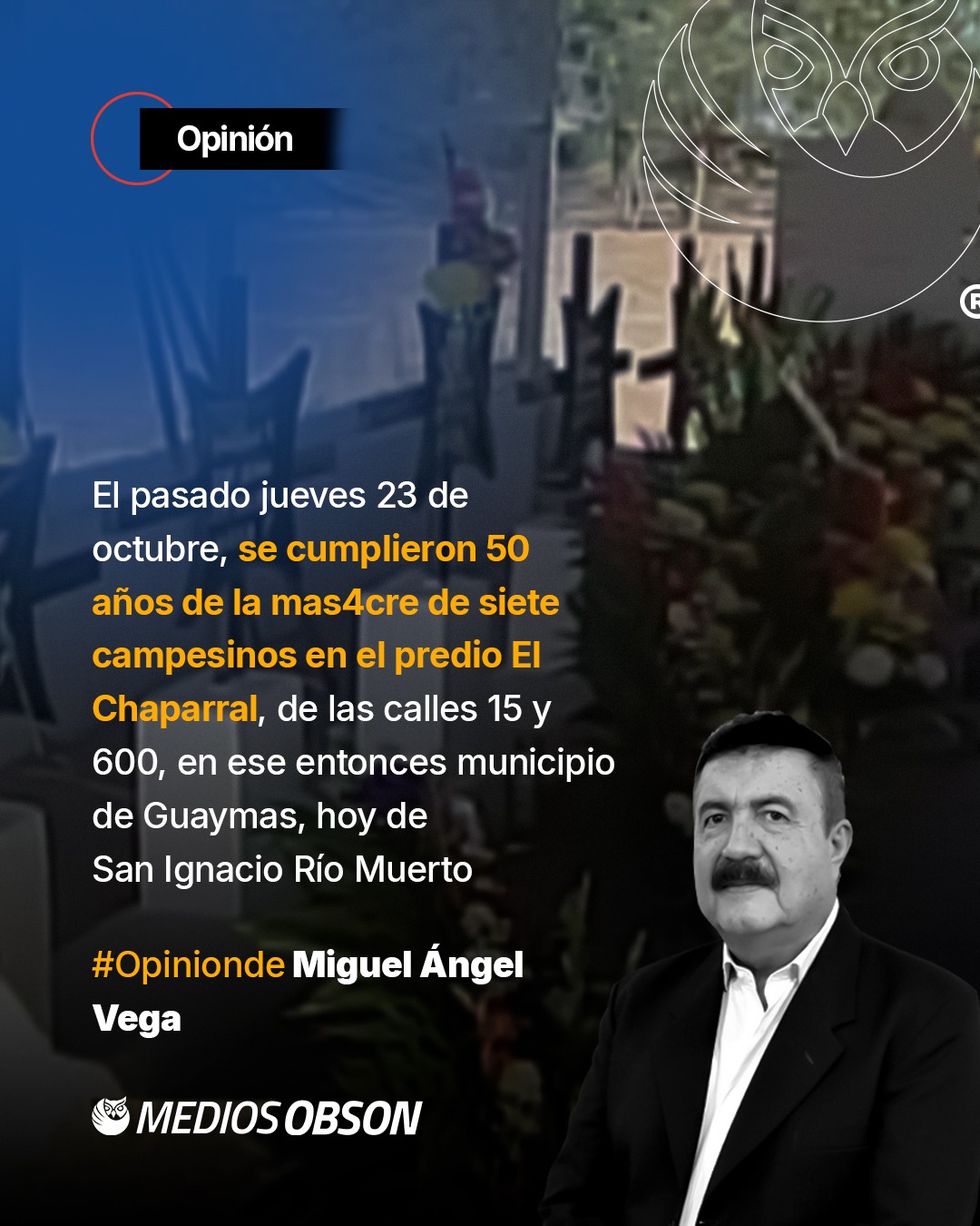 El pasado jueves 23 de octubre, se cumplieron 50 años de la masacre de siete campesinos en el predio El Chaparral, de las calles 15 y 600, en ese entonces municipio de Guaymas, hoy de San Ignacio Río Muerto. Y esto se originó porque en aquel entonces, el gobierno del presidente LUIS ECHEVERRÍA ALVAREZ y algunos anteriores, habían ignorado las solicitudes de tierras de grupos campesinos, que se decidieron a invadir los terrenos del agricultor MIGUEL DENGEL HILTON, pero a quien le tocó consumar la masacre de campesinos, fue el gobernador CARLOS ARMANDO BIEBRICH TORRES, que le ordenó al entonces director general de la extinta Policía Judicial del Estado (PJE) FRANCISCO ARELLANO NOBLECÍA, desalojar a balazos a los campesinos de dicho predio, cuyo único delito era buscar un patrimonio para sus familias. Así fue como la madrugada del jueves 23 de octubre arribaron los sicarios disfrazados de policías y apoyados por soldados, acabando con la vida del líder JUAN DE DIOS TERÁN ENRÍQUEZ y sus compañeros RAFAEL LÓPEZ VIZCARRA, los hermanos ROGELIO Y BENJAMÍN ROBLES RUIZ, ENRIQUE FÉLIX FLORES, GILDARDO GIL OCHOA, en tanto de los 15 que resultaron heridos, don MIGUEL GUTIÉRREZ QUIÑONES, falleció otro día en un hospital de la localidad. Y claro, estas atrocidades provocaron por un lado que saliera de la gubernatura el mandatario oriundo de Sahuaripa, pero lo mejor de todo es que los sangrientos hechos, fueron el detonante para que se vinieran la repartición de tierras de 1976 en los Valles del Yaqui y Mayo. Y en el caso de Río Muerto, se repartieron 4,330 hectáreas entre 433 campesinos convertidos ya a ejidatarios derechosos a 10 hectáreas cada uno. Pero ojo, los siete campesinos tuvieron que ofrendar su vida para que se repartieran los terrenos, porque el gobierno los ignoraba, de forma muy similar a como en nuestros días los ignora el gobierno de la llamada 4T, instaurado por el expresidente ANDRÉS MANUEL LÓPEZ OBRADOR, quien le borró del mapa todos los apoyos al campo y solo estableció migajas para productores de autoconsumo en programas sociales con tintes más electoreros que otra cosa, pero a los productores que generan los alimentos que nos comemos a diario en nuestros hogares, les quitó los apoyos en todos los sentidos, dejándolos en una indefensión que actualmente mantiene al campo en agonía. Y antes de entrar más en materia queremos decirle que el ejido San Ignacio Río Muerto, encabezado atinadamente por JUAN DE DIOS TERÁN QUIROZ, hijo del líder y mártir del mismo nombre, encabezó un acto de conmemoración, donde alumnos de primaria simularon el acto de la masacre con una parodia, donde cayeron los 7 campesinos masacrados por la PJE, cuyos familiares presentes, volvieron a vivir el dolor y derramaron lágrimas a 50 años de los fatídicos hechos. Y luego de este acto tan emotivo que aglomeró a centenares de sanignacenses, se llevó a cabo una reunión en la que participaron varias líderes ejidales del sur de Sonora, encabezadas por personajes como el profesor MIGUEL ÁNGEL CASTRO COSÍO, líder de la Unión General Obrera, Campesina y Popular (UGOCP); el presidente del Ejido San Ignacio, JUAN DE DIOS TERÁN QUIROZ y el alcalde ABEL GONZÁLEZ AMBRIZ, donde sin cortapisas se habló por lo claro en torno a la situación desesperante que se vive actualmente en el campo mexicano. El primero en dirigir un mensaje fue el propio líder Terán Quiroz, quien dijo que ya van dos años que no se siembra en el Valle del Yaqui y la verdad el campo no aguanta otro año más. Ante lo cual invitó tanto a sus compañeros ejidatarios de Río Muerto, como a los demás líderes presentes del sur de la entidad a impulsar una lucha con el fin de que el gobierno de la presidenta CLAUDIA SHEINBAUM PARDO, sí los escuche, los atienda, pero sobre todo que implemente programas de rescate, porque de lo contrario se vendrá un caos en el campo de pronóstico reservado. Para ello dijo que se encuentran en reuniones y preparando un oficio colectivo que le piensan hacer llegar a la primera mandataria del país, pero dijo que eso tiene que ser ya porque la situación es de carácter urgente, antes que esto truene por completo. Por su parte, el profesor Castro Cossío, lanzó un mensaje tronante dirigido al gobierno, exigiéndole que se deje de simulaciones, mentiras y engaños institucionalizado de políticos y politiqueros profesionales en la materia. Pidió a los campesinos no dejar de luchar por el reparto equitativo del agua y por todos los derechos que les asisten, por los que no le deben rogar a nadie, sino exigirlos. Por su parte el alcalde González Ambriz, se comprometió ante los presentes a mantenerse siempre en la disposición de apoyarlos en todo lo que como autoridad municipal esté a su alcance, como el tocar puertos en las diferentes instancias del gobierno estatal y federal, finalizó diciendo. Y es que la situación que vive el Valle del Yaqui, actualmente es verdaderamente desesperante, porque si bien es cierto han venido arrastrando siempre con una serie de problemas que los han movilizado a luchas que les han permitido conquistas que se disfrutaban y que implicaban dispersión de recursos en el sur de Sonora, donde este año por falta de siembras dejaron de circular alrededor de 18 mil millones de pesos, cuya ruina repercute en toda la cadena económica, que empieza por los agricultores, los transportistas, refaccionarias, mecánicos, soldadores, vulcanizadores, tortilleros, carroceros, regadores, jornaleros, restauranteros, comerciantes e industriales que han dejado de recibir esos recursos. Lo anterior fue más notorio desde que llegó López Obrador al poder que se desatendió del campo, pero en el Valle del Yaqui, resintieron más por la sequía recurrente de dos años, sin embargo, ahora que llovió un poco más, alrededor de mil productores se niegan a sembrar porque los precios de garantía ya no existen y por tanto la rentabilidad en el campo anda por 