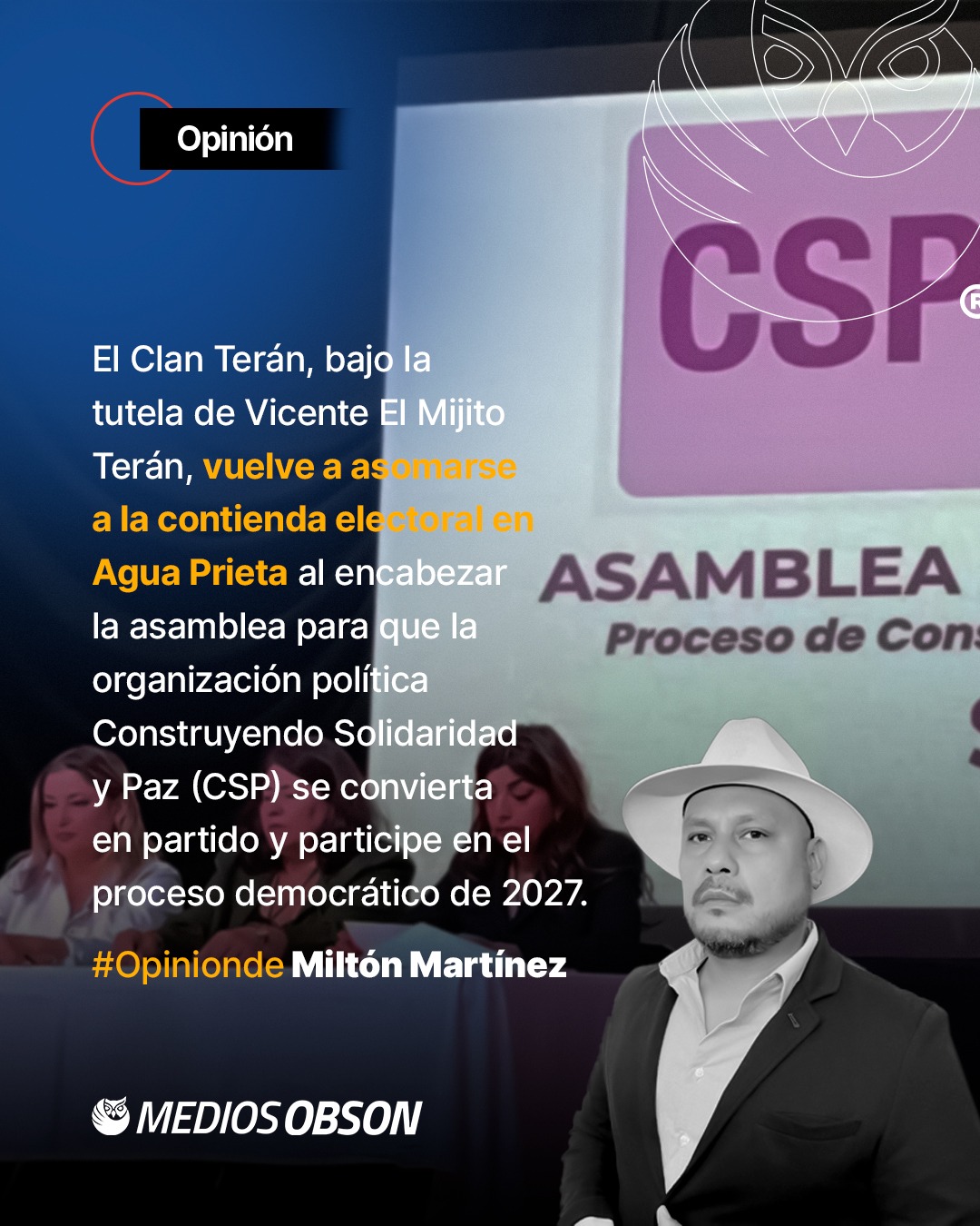 El Clan Terán, bajo la tutela de Vicente El Mijito Terán, vuelve a asomarse a la contienda electoral en Agua Prieta al encabezar la asamblea para que la organización política Construyendo Solidaridad y Paz (CSP) se convierta en partido y participe en el proceso democrático de 2027.