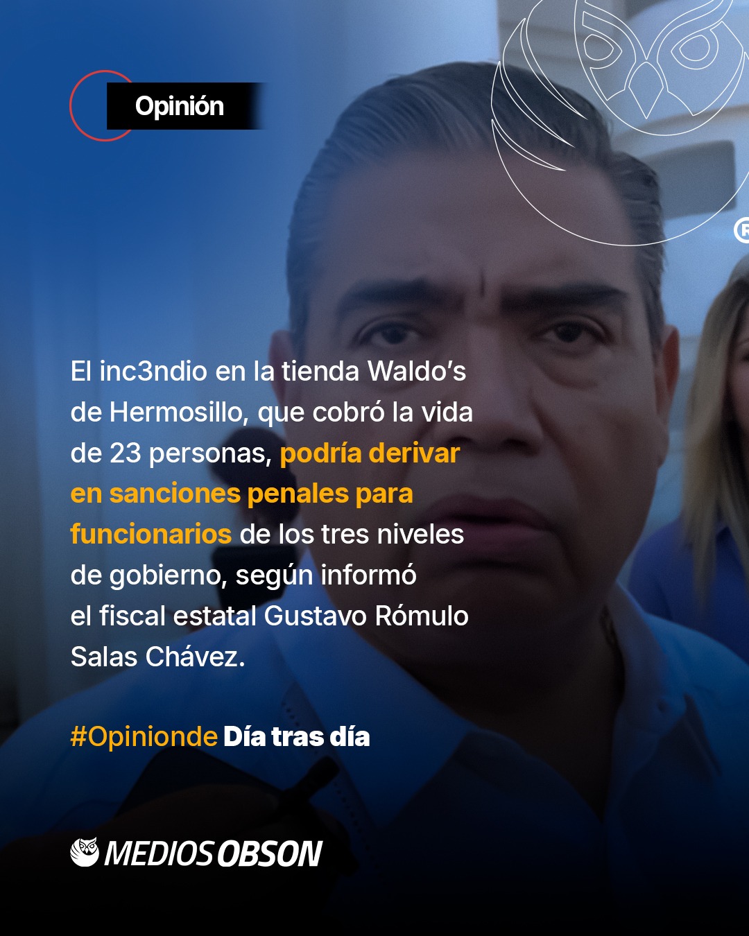 El incendio en la tienda Waldo’s de Hermosillo, que cobró la vida de 23 personas, podría derivar en sanciones penales para funcionarios de los tres niveles de gobierno, según informó el fiscal estatal Gustavo Rómulo Salas Chávez. La tragedia expuso fallas graves en materia de protección civil, pues el establecimiento operaba sin un programa interno vigente desde 2019, una omisión que compromete tanto a la empresa como a las autoridades que debieron supervisarla. El anuncio de que servidores públicos municipales, estatales y federales serán llamados a comparecer ante el Ministerio Público es un paso necesario para esclarecer las responsabilidades que rodean este lamentable hecho. Más allá de las declaraciones, la sociedad sonorense espera una investigación transparente y sin privilegios, que marque un precedente sobre la obligación de cumplir y hacer cumplir las normas de seguridad. Este caso debe servir no solo para castigar negligencias, sino también para revisar de fondo los protocolos de inspección, la rendición de cuentas y la cultura de prevención en espacios públicos. La justicia, si se aplica con rigor, puede evitar que la tragedia se repita.