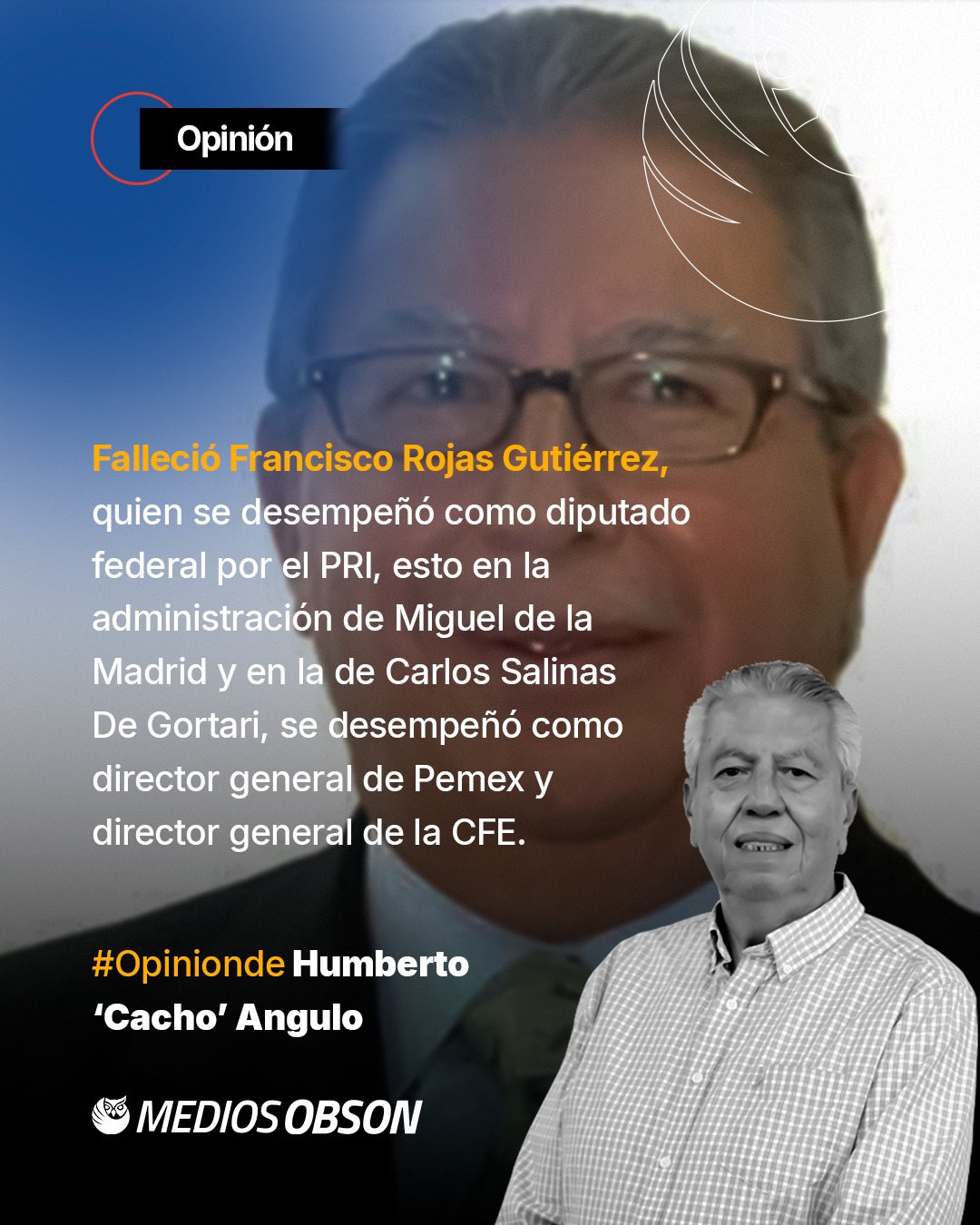 El día de ayer falleció FRANCISCO ROJAS GUTIÉRREZ, quien se desempeñó como diputado federal por el Partido Revolucionario Institucional, coordinando en su legislatura la fracción tricolor, esto en la administración de MIGUEL DE LA MADRID y en la de CARLOS SALINAS DE GORTARI, se desempeñó como director general de Pemex y director general de la Comisión Federal de Electricidad, fue hermano de CARLOS ROJAS también funcionario del gobierno federal…
