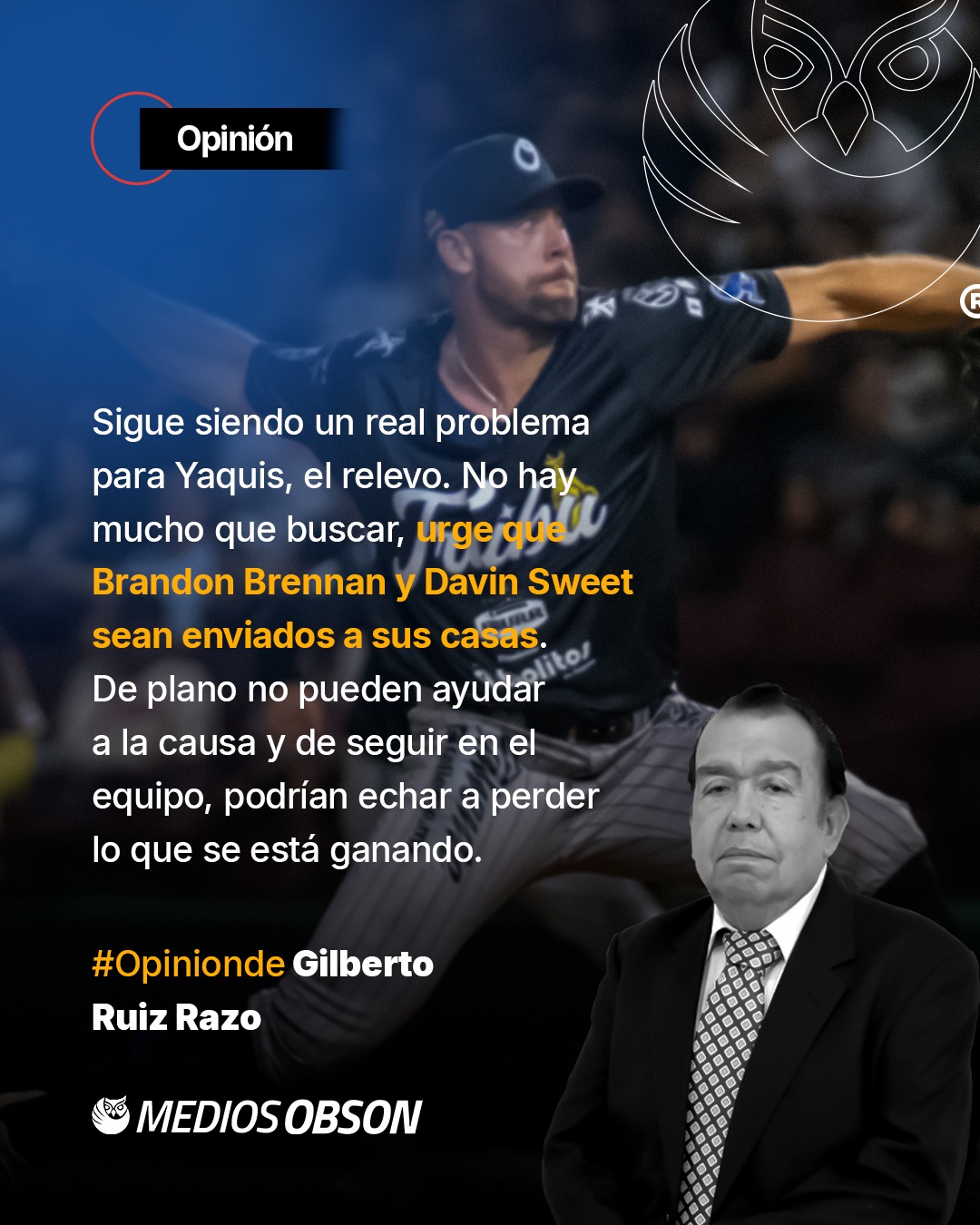 OJO.- Pero sigue siendo un real problema para Yaquis, el relevo. No hay mucho que buscar, urge que Brandon Brennan y Davin Sweet sean enviados a sus casas. De plano no pueden ayudar a la causa y de seguir en el equipo, podrían echar a perder lo que se está ganando. Corresponde a los directivos buscar un par de lanzadores que vengan a darle punch al bullpén. O, en su defecto, el mismo manejador podría recomendar a un par de relevistas ya sea de la organización de Detroit o de otra parte. Pero buscar que vengan hasta donde llegue el equipo, No se vale que vengan por un mes. Ya acercándose diciembre, es más difícil que acepten venir.