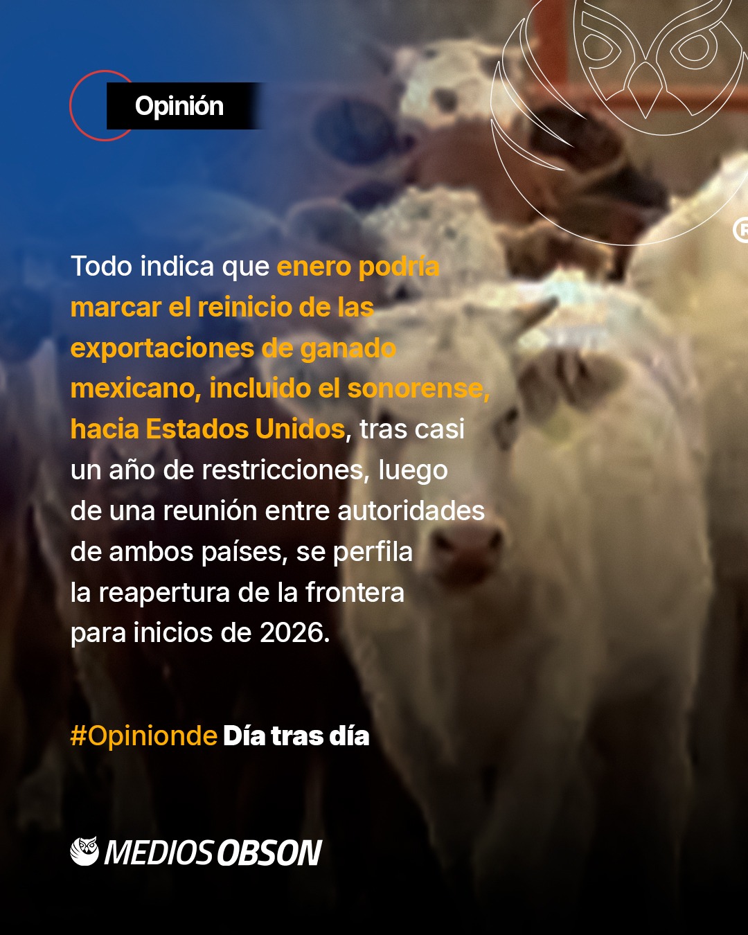 Todo indica que enero podría marcar el reinicio de las exportaciones de ganado mexicano, incluido el sonorense, hacia Estados Unidos, tras casi un año de restricciones. El presidente de la Unión Ganadera Regional de Sonora, Juan Ochoa Valenzuela, adelantó que, luego de una reunión entre autoridades de ambos países, se perfila la reapertura de la frontera para inicios de 2026. Aunque aún falta la confirmación oficial, el sector ganadero mantiene expectativas altas ante esta posible reactivación, ya que la pausa comercial ha dejado pérdidas millonarias y la suspensión de alrededor de 150 mil cabezas de ganado. Los productores piden que, como parte del acuerdo, se amplíe y modernice la estación cuarentenaria de Nogales, a fin de agilizar los envíos y evitar nuevos cuellos de botella en el proceso de exportación. De concretarse, esta reapertura significaría un respiro importante para la economía rural de Sonora, que ha resentido con fuerza el cierre, y abriría nuevamente el flujo comercial que históricamente ha sido uno de los pilares del campo sonorense.