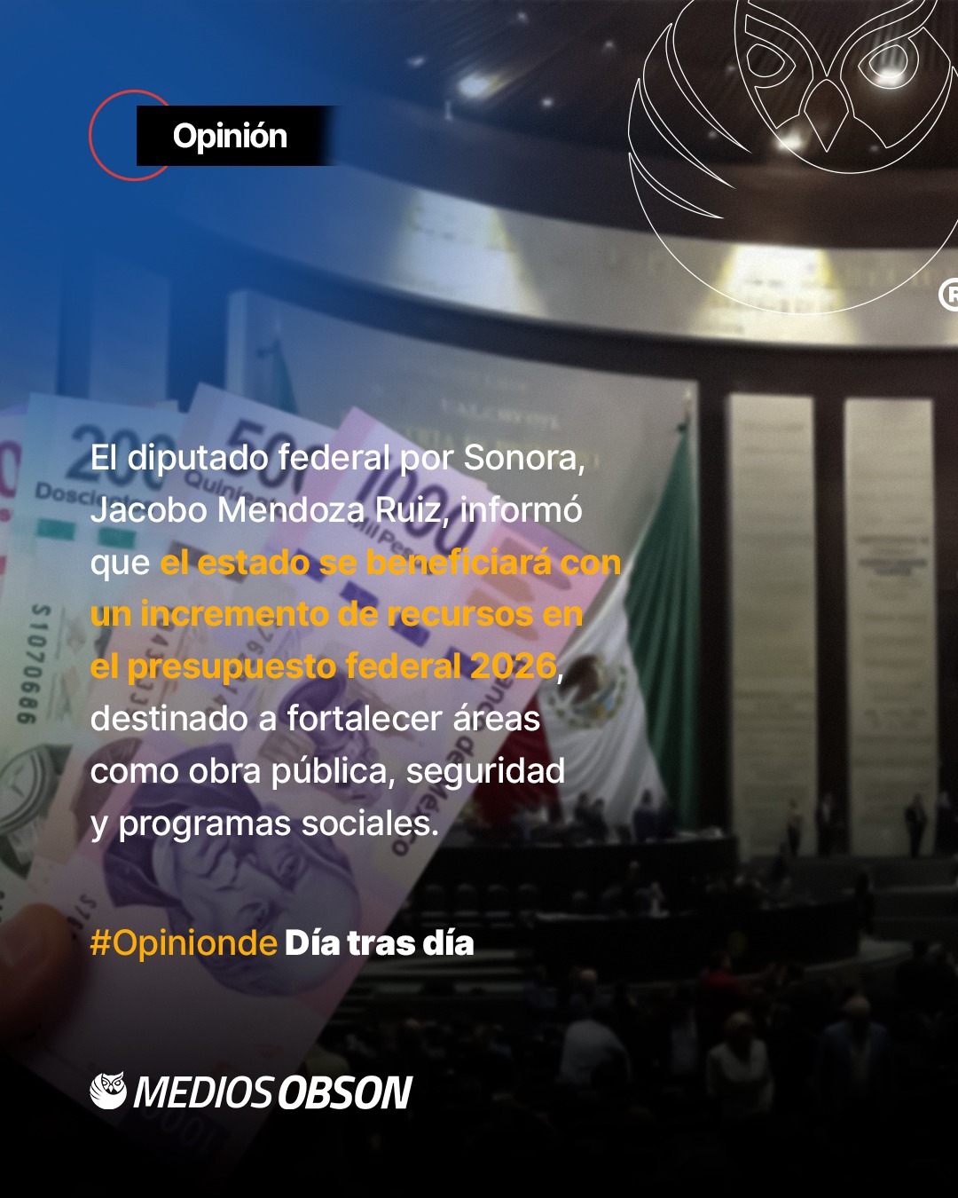 El diputado federal por Sonora, Jacobo Mendoza Ruiz, informó que el estado se beneficiará con un incremento de recursos en el presupuesto federal 2026, destinado a fortalecer áreas como obra pública, seguridad y programas sociales. Explicó que el gasto federalizado para Sonora pasará de 60 mil millones de pesos ejercidos en 2025 a 61 mil 400 millones para el próximo año, correspondientes a los ramos 28 y 33, que contemplan participaciones y aportaciones federales. Además, destacó que el paquete económico incluye una bolsa adicional de 20 mil millones de pesos para programas de fortalecimiento a la seguridad, de los cuales Sonora recibirá una parte significativa. Mendoza Ruiz señaló que estos recursos permitirán financiar proyectos de infraestructura en curso y nuevas obras que iniciarán en 2026, como carreteras y el proyecto ferroviario impulsado por la federación. Aseguró que el presupuesto aprobado en la Cámara de Diputados refleja el compromiso del gobierno federal con el desarrollo regional y la mejora de las condiciones sociales y económicas de los sonorenses.