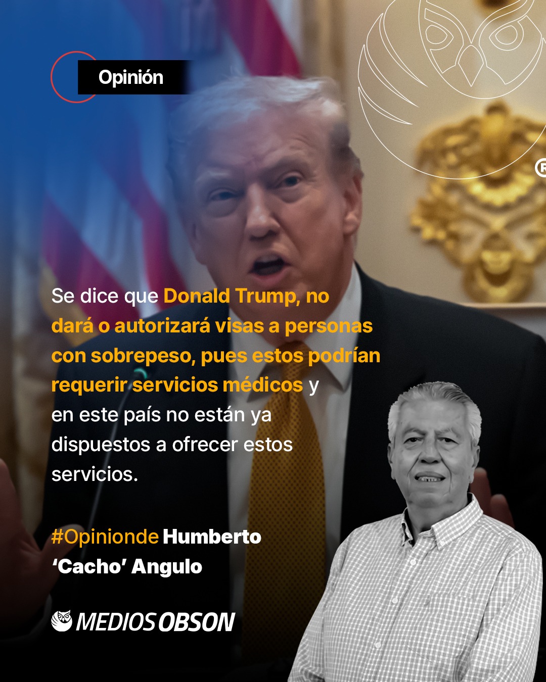 Otro mensaje recorre las redes sociales en las que nos dicen que DONALD TRUMP, no dará o autorizará visas a los gorditos y gorditas, pues estos podrían requerir servicios médicos y en este país no están ya dispuestos de ofrecer estos servicios, en lo personal creo que esta persona que hace estos comentarios está equivocada, en sus apreciaciones pues creo que el mandatario estadounidense se refiere sólo a las mujeres embarazadas, pues estas en muchas ocasiones vienen a los Estados Unidos a recibir el servicio médico en hospitales de este país, por los servicios de emergencia y no solo no pagan sus servicios, sino que además estos descendientes, en automático pasan a ser norteamericanos y con los beneficios que para ello significan. Pero de todos modos lo investigaremos para efectos de no equivocarnos y darles una información errónea…