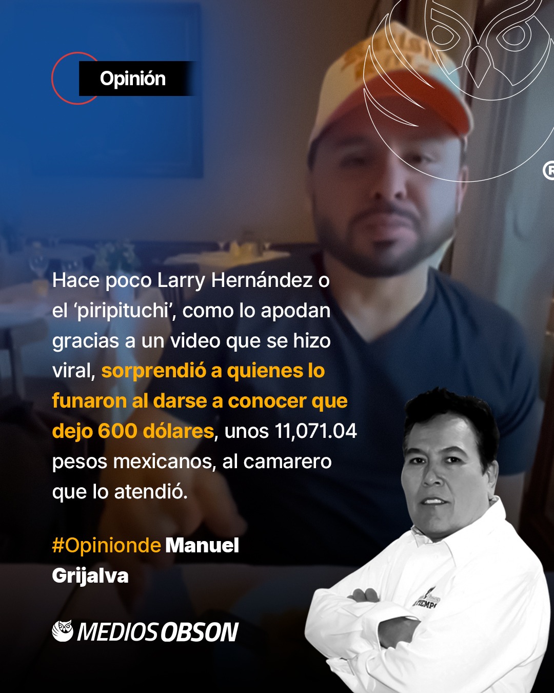 A mí ya no me preocupa eso de cerrar ciclos, con que me cierre el pantalón me conformo… De plano, quienes nunca van a salir de lo mismo son ‘Los Mascabrothers’, Raúl Araiza, María Elena Saldaña, Pepe Magaña y Pierre Ángelo, quienes año tras año esperan esta época del año para poder trabajar, siendo esta la única oportunidad que tienen para generar un poco de dinero, pues han encontrado en el ‘Tenorio Cómico’ su única fuente de ingresos, fuera de esa puesta en escena ningún productor los llama para ser parte de sus espectáculos, mucho menos para participar en alguna otra propuesta teatral y como en televisión ya no existe la barra de comedia, pues se han quedado sin trabajo, no todos ellos presentan su show en solitario, es por eso que con ansias locas esperan los dos últimos meses del año, haciendo changuitos y rezando para que de nuevo los llamen para ser parte de dicha comedia teatral… No solo se trata de evitar las malas energías, hay que procurar no ser una de ellas… La verdad es que no creo en la generosidad y en el buen corazón de Larry Hernández, pues si en verdad desea ayudar o aportar su apoyo a quien lo necesite, el cantante no andaría grabándose para que todo mundo se enteré de su buena obra, si lo hace es porque realmente lo que busca es hacerse publicidad a costilla de la necesidad de otros… hace poco el ‘piripituchi’, – como lo apodan gracias a un video que se hizo viral, – sorprendió a quienes lo funaron en 2015 y en mayo de 2024 al darse a conocer que dejo 600 dólares, – unos 11,071.04 pesos mexicanos, – al camarero que lo atendió junto con a sus amistades, eso en atención por su buen servicio… aquí lo extraño de todo es que ese momento, – el cual debió ser privado, – hasta en el programa de chismes de espectáculos llamado ‘El gordo y la flaca’ salió, por lo que es de suponer que todo fue planeado por el cantante que ha sido acusado por su agresividad, mala educación, hasta por un intento de secuestro y es que hasta posa a la cámara de televisión cuando hace entrega de tan jugosa propina… hoy en día no estamos como para dejarnos engañar, mucho menos para que nos vean la cara, eso aquí y en China se le llama aprovecharse del indefenso para acaparar la atención de los medios de comunicación y así empiecen a darle cabida en sus espacios informativos y es que al desplomarse su fama dejó de ‘generar’ ingresos, por lo que necesita reactivarse… El que necesita ser visto al ayudar, ayuda más a su ego que a los demás… ¡Y va de nuez!, una vez más les anunciamos y al mismo tiempo los invitamos a que este viernes 14 de noviembre asistan al lugar en donde antes se celebraba la recordada Expo Obregón y es que ahí en 4 días más estará cortándose el listón inaugural de la primera edición de ExpoFest Cajeme 2025… en su primer noche de actividades la ExpoFest Cajeme tiene muchas sorpresas para sus visitantes, ¡que no le cuenten!, mejor háganse presentes para que sean ustedes mismos quienes descubran todas las novedades que nos han preparado, no hay excusa, ni pretextos, pues esta fiesta ha sido preparada para toda la familia, recuerden que el costo del boleto de entrada para los niños es de tan sólo treinta pesos, mientras que el boleto para adulto está en setenta pesos, resultando ser este un precio bastante económico, a cambio de eso podrán vivir momentos únicos e inolvidables… El dinero hace a los hombres ricos, el conocimiento hace a los hombres sabios, y la humildad hace a los hombres grandes… Etcétera…