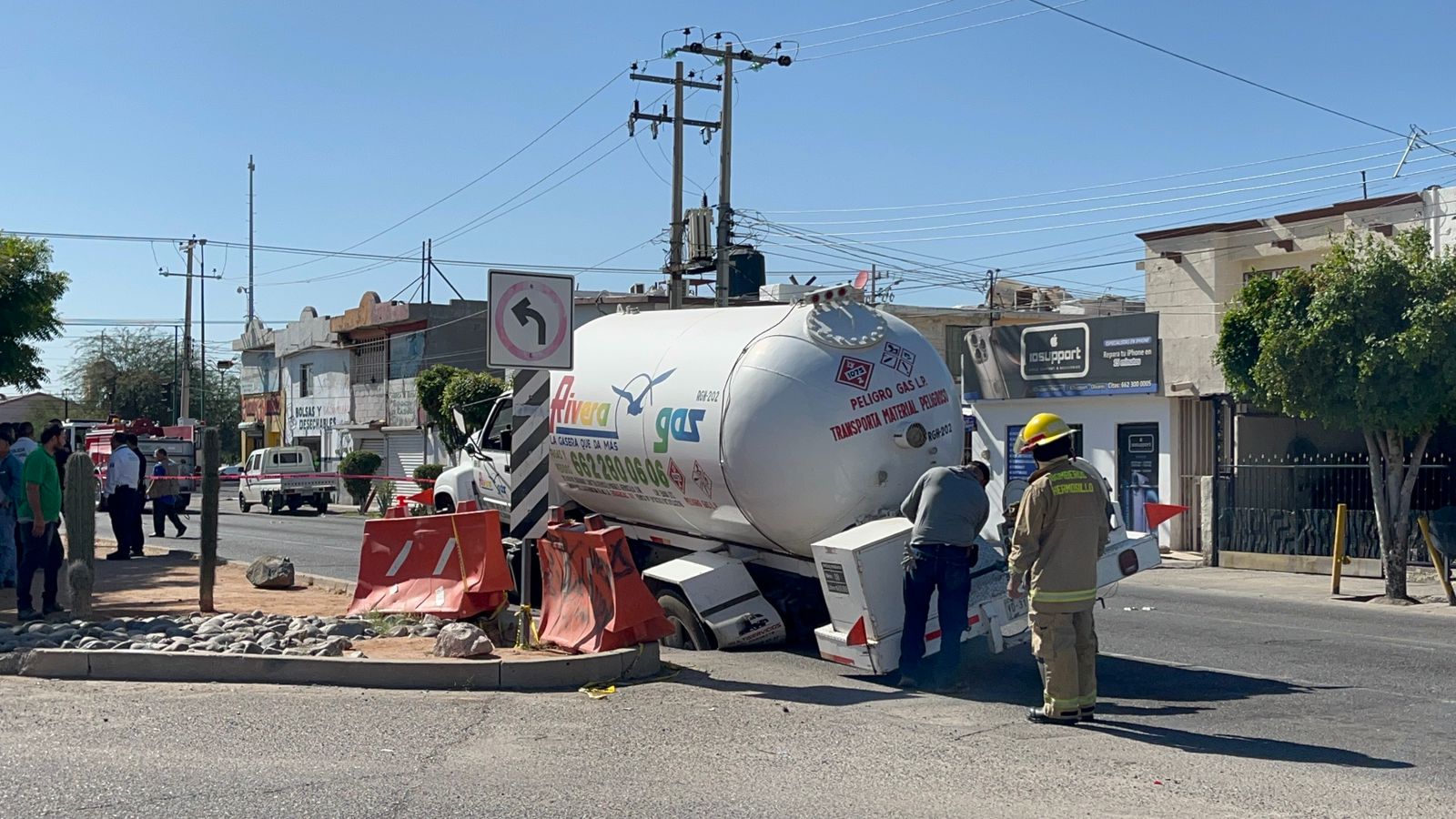 Hermosillo, Sonora.- Elementos del Departamento de Bomberos atendieron un llamado de emergencia luego de que una pipa cargada con combustible cayera parcialmente en un socavón, en un lote cercano a una gasolinera al norte de la ciudad.