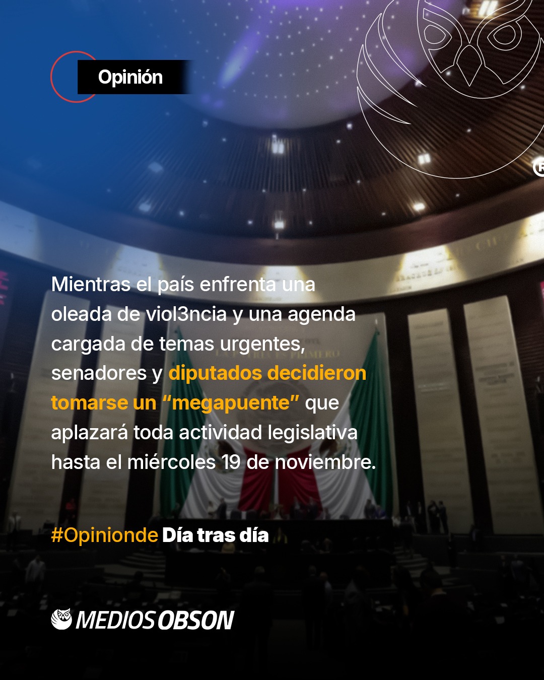 Mientras el país enfrenta una oleada de violencia y una agenda cargada de temas urgentes, senadores y diputados decidieron tomarse un “megapuente” que aplazará toda actividad legislativa hasta el miércoles 19 de noviembre. En el Senado quedan en pausa asuntos tan relevantes como la Ley de Extorsión, la aprobación de magistrados electorales locales y el seguimiento al asesinato del alcalde de Uruapan, Carlos Manzo, un hecho que volvió a exhibir la presión del crimen organizado sobre gobiernos locales. El descanso llega, además, en medio de los señalamientos que rodean a la senadora morenista Olga Patricia Sosa, presuntamente investigada en Estados Unidos por huachicol fiscal y financiamiento ilícito a campañas republicanas, generando un clima adicional de incertidumbre. En San Lázaro, las y los diputados también suspenden actividades, dejando pendientes de alto impacto como la discusión de la Ley General de Aguas y la polémica iniciativa para adelantar la revocación de mandato de Claudia Sheinbaum a 2027. Todo esto ocurre en un contexto de creciente tensión entre oficialismo y oposición, especialmente visible en los constantes choques entre Gerardo Fernández Noroña y Lilly Téllez, cuyas confrontaciones han eclipsado debates de fondo. El megapuente, así, exhibe un contraste incómodo: mientras el país espera respuestas, el Congreso se toma un descanso prolongado.