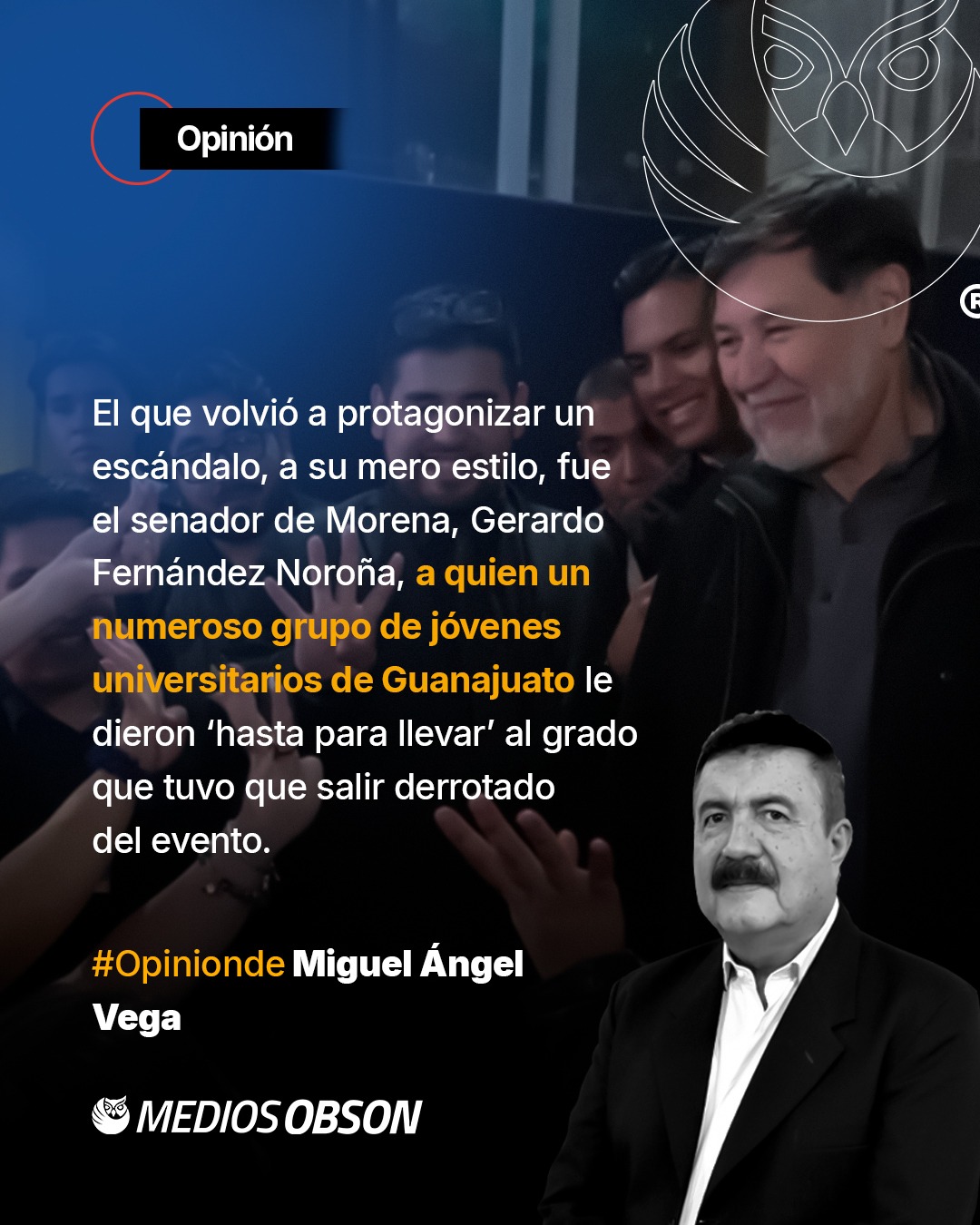 El que volvió a protagonizar un escándalo, a su mero estilo pendenciero y ridículo, fue el senador de Morena, GERARDO FERNÁNDEZ NOROÑA, a quien un numeroso grupo de jóvenes universitarios de Guanajuato le dieron hasta para llevar al grado que tuvo que salir derrotado del evento, donde seguramente en sus sueños guajiros pretendía promocionarse como aspirante presidencial, por el aire que le han metido en la cabeza algunos de sus seguidores morenistas con una espantosa escasez de materia gris. Y es que en sus aires de precandidato presidencial para el 2030, les empezó a presumir que la 4T era lo máximo, convencido de que los universitarios caería en sus cuentos chinos de austeridad y de combate a la corrupción, tan cacareados falsamente por el expresidente ANDRÉS MANUEL LÓPEZ OBRADOR, pero los jóvenes le empezaron a lanzar cuestionamientos relacionados primeramente con “el chinamito” ese de 12 millones de pesos que acaba de adquirir en la Ciudad de México y después le empezaron a sacar los trapitos al sol respecto de la vida de reyes que se han venido dando varios personajes ligados estrechamente a la 4T, como RICARDO MONREAL ÁVILA, coordinador de los diputados de Morena en San Lázaro; o el propio “ANDY” LÓPEZ BELTRÁN, muy en ello, secretario de organización del Comité Nacional de Morena. Sin dejar de gritarle el blindaje que le brinda Morena al coordinador de sus senadores ADÁN AUGUSTO LÓPEZ HERNÁNDEZ y puras de esas. Y así es como se le fue descomponiendo el ambiente en el evento donde los muchachos le empezaron a gritar en coro: “Fuera, fuera, fuera”. Y él les respondía gritando como “vieja tamalera” (dicho con todo respeto para las doñas que elabora esta ricura de alimento) por el micrófono que tenía en sus manos, pero solo se escuchaba una novelería, donde el ambiente en lugar de parecer una conferencia ordenada como es común en estos casos, más bien parecía un gallinero alborotado, como cuando les ronda el coyote en sus alrededores.