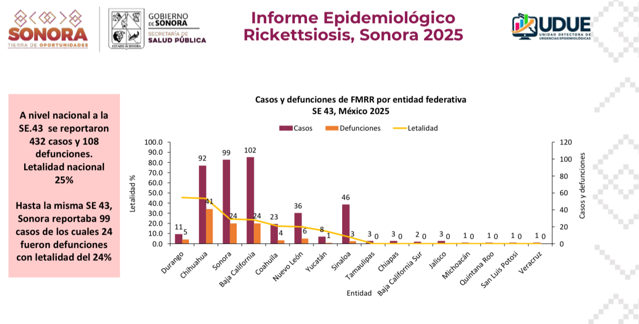 A nivel nacional, el panorama tampoco es sencillo. Hasta la semana 43 se habían confirmado 432 casos de rickettsiosis y 108 defunciones, lo que deja una letalidad del 25%.