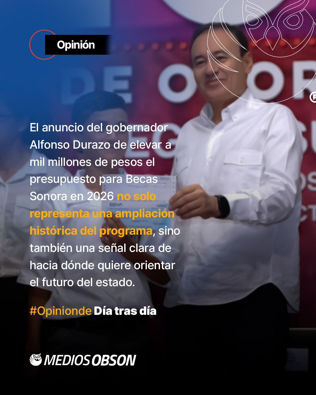 El anuncio del gobernador Alfonso Durazo de elevar a mil millones de pesos el presupuesto para Becas Sonora en 2026 no solo representa una ampliación histórica del programa, sino también una señal clara de hacia dónde quiere orientar el futuro del estado: hacia la educación como motor de movilidad social. En un país donde la desigualdad sigue marcando destinos, apostar por las niñas, niños y jóvenes con apoyos que garanticen su permanencia en las aulas es una decisión que trasciende coyunturas políticas. Desde su primer año de gobierno, Durazo ha incrementado de manera sostenida estos recursos —de 400 millones a 830 millones en el ejercicio actual— y ahora plantea un salto sin precedentes que consolida a Sonora de Oportunidades como el programa de becas más grande en la historia del estado. Más allá de la cifra, lo relevante es el mensaje: invertir en la formación académica es invertir en una sociedad más justa. El reto, por supuesto, será asegurar que cada peso se traduzca en verdaderas oportunidades y que los apoyos lleguen a quienes más los necesitan. Si se logra, este esfuerzo presupuestal podría convertirse en uno de los legados más significativos del actual gobierno, un punto de inflexión para miles de familias sonorenses.