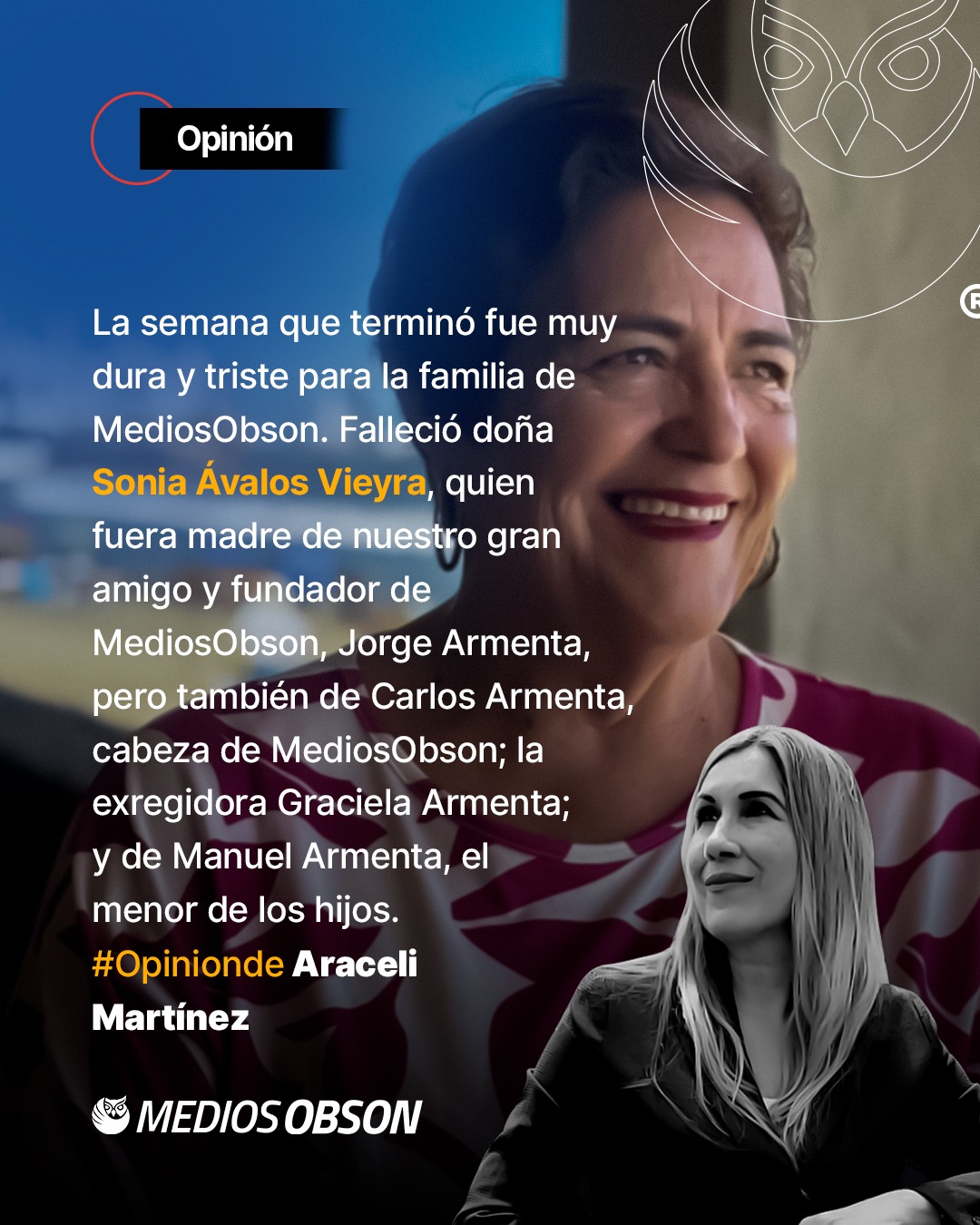 La semana que terminó fue muy dura y triste para la familia de MediosObson. Falleció doña Sonia Ávalos Vieyra, quien fuera madre de nuestro gran amigo y fundador de MediosObson, Jorge Armenta, pero también de Carlos Armenta, cabeza de MediosObson; la exregidora Graciela Armenta; y de Manuel Armenta, el menor de los hijos.