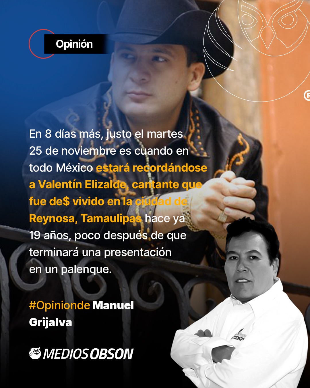 Qué sabios son los refranes, esos de toda la vida y que cada vez usamos menos… En 8 días más, justo el martes 25 de noviembre es cuando en todo México estará recordándose a Valentín Elizalde, cantante que fue desvivido en la ciudad de Reynosa, Tamaulipas hace ya 19 años, poco después de que terminará una presentación en un palenque de aquella localidad… al momento de su muerte el intérprete de ‘Vete ya’ y ‘Como me duele’ contaba con apenas 27 años de edad, es decir, ¡estaba en la flor de la juventud!, en ese entonces el ‘Gallo de Oro’, – como le gustaba ser llamado, – tenía muchas ilusiones y metas por cumplir, sus canciones apenas empezaban a ser conocidas en toda la república mexicana, pese a que en ese entonces era continuamente contratado para cantar en otros estados de México, entre sus planes nunca estuvo abandonar a ciudad Obregón para ir tras sus sueños y es que era muy agradecido con la tierra que le dio su primer oportunidad y que lo catapultó a la fama… se espera que en 2 martes más, en la estatua que se encuentra en Villa Bonita, – a un costado de la calle California, – al cantante se le rinda un pequeño pero emotivo homenaje en el que estarán honrando su memoria con algunos de sus éxitos, sus canciones favoritas también serán interpretadas por quienes en verdad lo conocieron y recuerdan con veneración… lo cierto es que a casi 20 años de su repentina partida a la vida eterna el recuerdo de Valentín Elizalde aún permanece intacto en el corazón y en la memoria de todos aquellos que lo conocimos, pues el cantante supo ganarse el cariño, el respeto y la admiración de gran parte de cajemenses por la bondad de su corazón, también por su carisma, talento, sencilles y humildad… por más años que pasen jamás habrá quien suplante o llene el vacío que ‘El Vale’ dejó en el corazón de muchos de nosotros, pues ha sido único e irrepetible, un amigo y un ser humano que nunca nadie podrá reemplazar, se fue, pero nos dejó el mejor de los recuerdos… Dicen: ‘no se le puede poner puertas al campo’, y vamos nosotros y queremos poner puertas a las aves… Gracias a Brenda Meza es que me enteré que las producciones teatrales de mi buen amigo Rafael Evans han seguido presentándose, por lo que su legado permanece vivo entre nosotros, lamentablemente a estas no se les han dado la difusión necesaria, es por eso que muchos ni enterados estamos, cuenta que ‘Los Morros de la Villa’ continúan activos y que los de ‘La Ruta’ permanecen vigentes, ¡lo que me da mucho gusto!, ahora nuestro deber es difundir esas presentaciones cada vez que nos enteremos, ¡así más gente podrá asistir y apreciarlas!… Argelia Mascareño tiene mucha razón, pues a ninguna presentación he asistido debido a que ni me he enterado cuando y donde serán presentadas y no Anna Cárdenas, nunca aquí se ha hablado mal del buen Evans, sino al contrario, aquí siempre se le apoyó en todo lo que se pudo, tanto así que junto con él colaboramos en varias temporadas de ‘Don Juan, un Tenorio muy norteño’… seguro estoy que si al buen Rafa le hubieran dado la dirección de la casa de cultura del municipio de Cajeme mucho talento hoy en día estuviera brillando y es que él merecía esa y muchas otras oportunidades más, aunque siempre se le apoyó, ese apoyo nunca fue suficiente y es que él se merecía todo… Tu talento es un regalo de Dios para ti, lo que hagas con él es tú regalo a Dios… Etcétera…