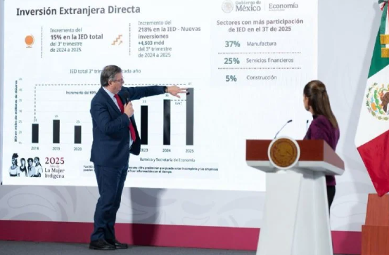 CIUDAD DE MÉXICO. El país cerrará el último trimestre de 2025 con un crecimiento del 15% en inversión extranjera directa (IED), alcanzando casi 41 mil millones de dólares, informó el secretario de Economía, Marcelo Ebrard, durante la Mañanera.