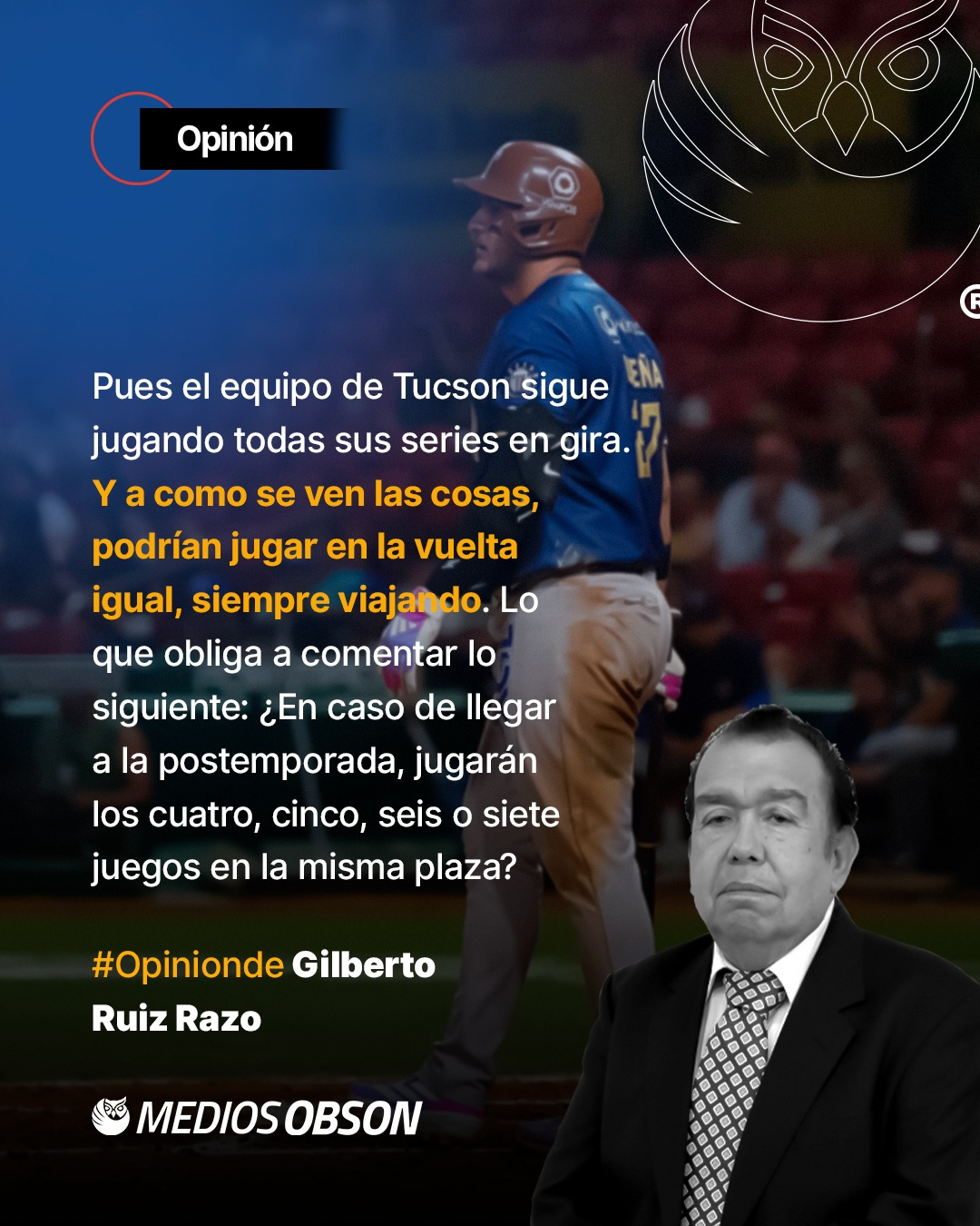 NADA.- Pues el equipo de Tucson Baseball Taeam sigue jugando todas sus series en gira. Y a como se ven las cosas, podrían jugar en la vuelta igual, siempre viajando. Lo que obliga a comentar lo siguiente: ¿En caso de llegar a la postemporada, jugarán los cuatro, cinco, seis o siete juegos en la misma plaza?. Vaya problema en que se metió Víctor Cuevas Valenzuela, presidente y propietario de los que fueron Mayos de Navojoa, cuando presumía que tenía todo bajo control, para jugar en Tucson.