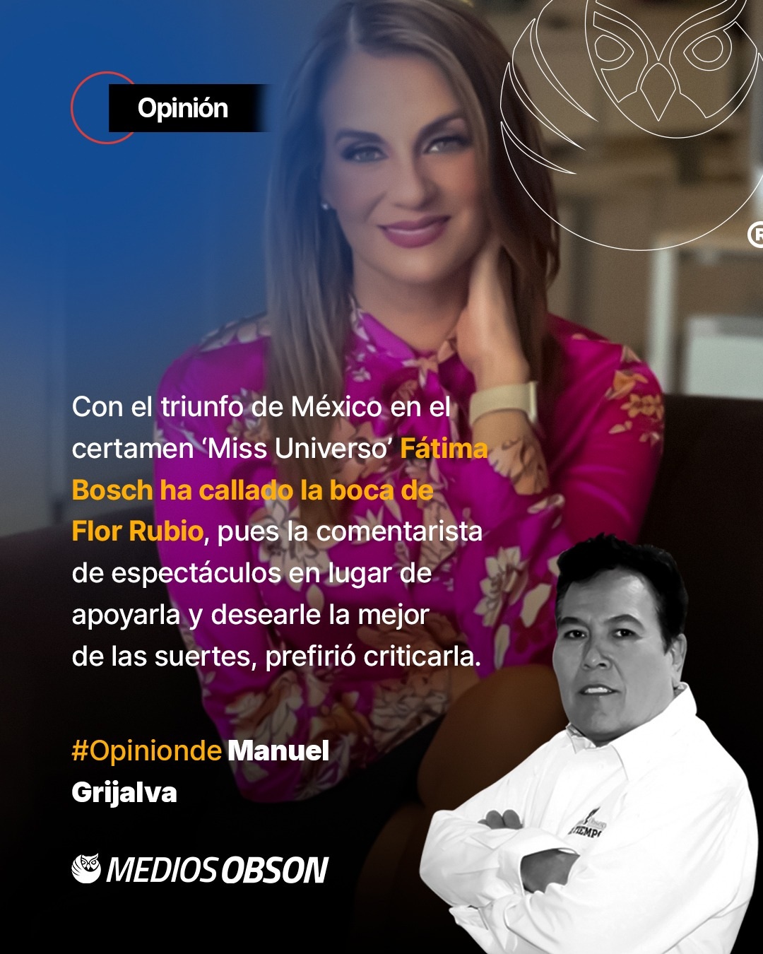 No busques ser el mejor en lo que haces, busca ser único… Con el triunfo de México en el certamen ‘Miss Universo’ Fátima Bosch ha callado la boca de Flor Rubio, pues la comentarista de espectáculos en lugar de apoyarla y desearle la mejor de las suertes, prefirió criticarla al comentar que el vestuario que la nueva reina de belleza llevaba al concurso internacional no era el ‘adecuado’, asegurando que era ‘muy poca cosa’, por lo que no creía que ganará en dicha competencia… al igual que lo hizo Cazzu, de quien dijo jamás llenaría un Auditorio Nacional, la hermosa tabasqueña le ha callado la boca al lograr ser coronada como ‘Miss Universo 2025’, demostrándole con esta victoria que no se necesitan de ‘grandes vestuarios’ para triunfar, sino tener la actitud y personalidad de una verdadera reina que promueva los valores y afronte las situaciones siendo una mujer ejemplar… en el pasado la ‘periodista’ de espectáculos ha hecho desafortunados comentarios, como cuando criticó a Belinda por un video relacionado con Ángela Aguilar, lo que le valió críticas en redes sociales… en otra una ocasión, Flor Rubio se mostró molesta porque Álex B, – hermano de Daniel Bisogno, – eligió no darle declaraciones, en otra ocasión comentó sobre la salud del actor Eduardo Yáñez, afirmando que él no padecía Parkinson, basándose en la experiencia con su propia madre, quien sí sufre la enfermedad… Rubio también generó controversia al opinar que Eleazar Gómez ‘ya había pagado su culpa’ tras su arresto por violencia familiar y que merecía una segunda oportunidad… el tener un micrófono en mano y el aparecer en televisión no la convierte en experta en algunos temas, tampoco es quien para culpar o señalar a otros, como quien dice ‘ve la paja en el ojo ajeno, pero no ve la viga que hay en el suyo’… Las palabras elegantes no son sinceras; las palabras sinceras no son elegantes… Tras haber sido sentenciado en una corte federal de California a tres años de libertad condicional y una multa de 1.5 millones de dólares, el cantante Gerardo Ortiz no sufre ni se acongoja, sino todo lo contrario, resurge como el ‘ave fénix’ y presenta su nuevo álbum, este lleva por título ‘El ejemplar’… el ‘focus track’ de este nuevo álbum lleva por nombre ‘Afectado’, un tema de decepción amorosa que cuenta con un video oficial dirigido por Carlos Pérez, donde el rojo del fuego aporta intensidad al sentimiento de la canción, mientras interpreta con firmeza una historia marcada por el desamor… ‘Por ahí, por ahí’, – junto a ‘Código FN’, – y ‘Échame el grito’, son dos sencillos que ofrecen una muestra del sonido que define esta nueva era de Gerardo Ortiz… Algunos hablan demasiado, pero sin decirlo todo… Algo que nunca antes había sucedido en el sur de Sonora es que los festejos del ‘Día del Músico’ se cambiarán de fecha, desde que tenemos uso de razón la fiesta de todos ellos siempre había sido justo el 22 de noviembre, fecha en la que se honra y cantan ‘Las mañanitas’ a Santa Cecilia, – patrona de todos los músicos, – ahora el huateque será mañana martes 25 de noviembre, fiesta que será musicalizada por Juan Ortega, ‘Los Reyes del Desierto’ y ‘Los Desertores’… ‘las ciudades destruyen las costumbres’ dice un verso de la canción de José Alfredo Jiménez, letra que refleja la idea de que la vida urbana puede erosionar las tradiciones y la vida rural, lo mismo sucedió con aquel tradicional baile que se anunciaba como ‘¡porque el 20 no se trabaja!’, que se dejó de hacer debido a que se cambió el día de descanso obligatorio para el tercer lunes de noviembre, razón por la que dejaron de venir a nuestra ciudad ‘Los Huracanes del Norte’ acabándose de esta manera con la tradición… Al final no son los años en nuestra vida lo que cuenta, sino la vida en nuestros años… Etcétera…