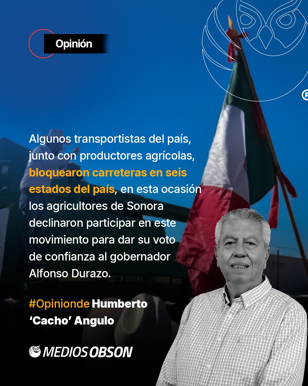 Así mismo, la misma prensa nacional nos señala que, en estos momentos algunos transportistas del país, junto con productores agrícolas, bloquean carreteras en seis estados del país, más los que se han acumulado, como el estado sonorense donde los productores agrícolas declararon que no harían bloqueos, pues ellos darían la confianza al gobernador ALFONSO DURAZO MONTAÑO, quien les prometió ser el gestor de este sector productivo y ellos dijeron no participarían por lo pronto, pero de pronto nos informan que la caseta de cobro de peaje de la jaula, ubicada al sur de Navojoa, había sido tomada por productores sinaloenses, lo mismo que la garita de entrada a los Estados Unidos de Nogales y una más en San Luis Río Colorado, estas también por sinaloenses.