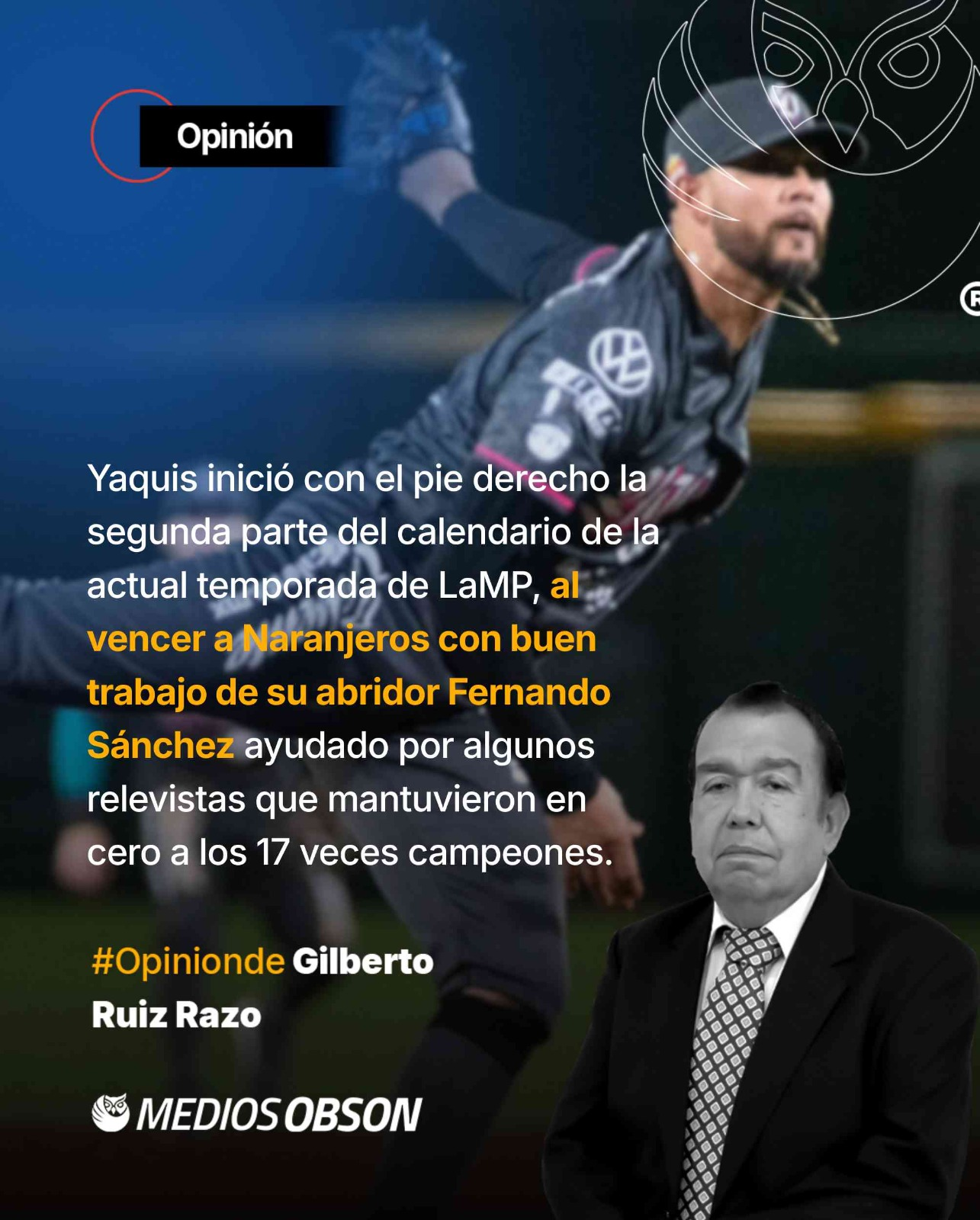 BIEN.- Yaquis inició, la noche del martes, con el pie derecho la segunda parte del calendario de la actual temporada de LaMP, al vencer a Naranjeros con buen trabajo de su abridor Fernando Sánchez ayudado por algunos relevistas que mantuvieron en cero a los 17 veces campeones. Esta noche se jugará el segundo de la entrevista y se espera una buna entrada. Mejor, tal vez, que los más de cuatro mil asistentes del martes.