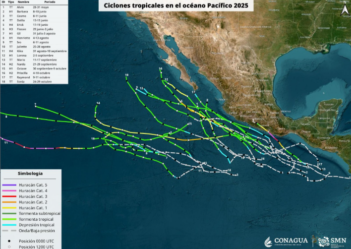 El total de ciclones tropicales con nombre que se presentaron durante la temporada 2025 fueron 31 de los cuales 18 se formaron en la cuenca del pacifico; 8 tormentas tropicales y 10 huracanes, mientras que en la cuenca del atlántico se formaron un total de 13 ciclones tropicales; 8 tormentas tropicales y 5 huracanes.
