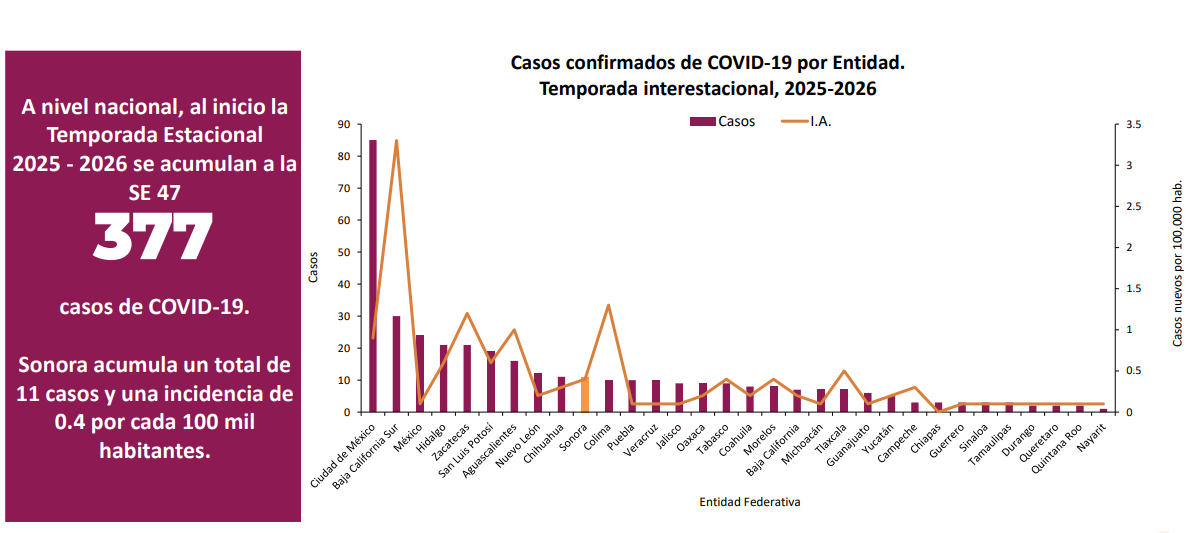 A nivel nacional, al inicio de la temporada estacional 2025-2026, se han acumulado 377 casos de COVID-19. Sonora aporta 11 de ellos, con una incidencia de 0.4 por cada 100 mil habitantes, ubicándose en el décimo lugar nacional. Las entidades con más casos son Ciudad de México, Baja California Sur, Estado de México, Hidalgo, Zacatecas y San Luis Potosí.