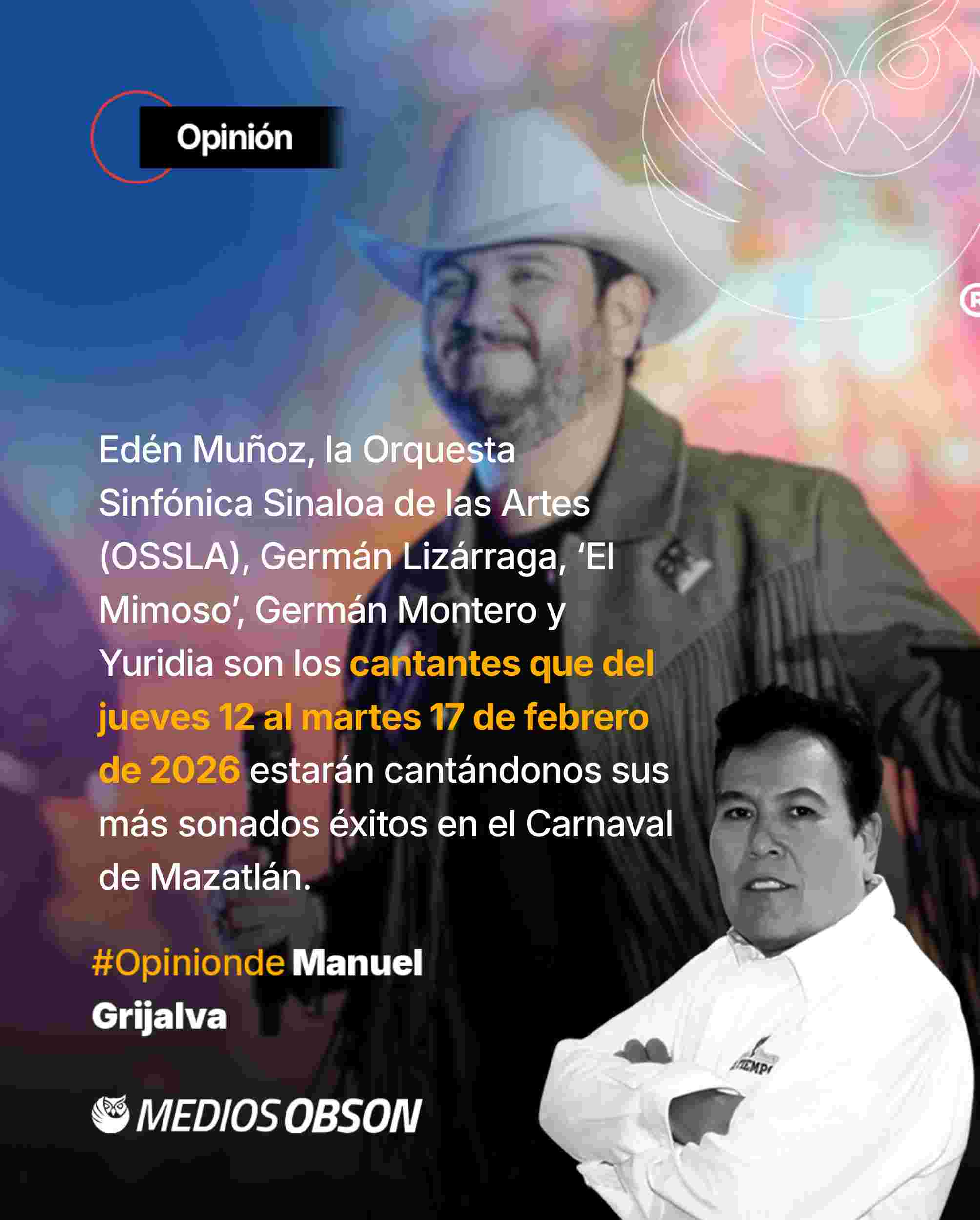 Si no puedes volar, corre. Si no puedes correr, camina. Si no puedes caminar, gatea, pero hagas lo que hagas, siempre sigue hacia adelante… Nada baratos están los boletos de ‘La Cura Fest’, – evento organizado por Carin León, – lo menos que los seguidores del cantante hermosillense tendrán que pagar por estar en el área general son mil doscientos cincuenta pesos, mientras que los más pudientes por estar cómodamente sentados en el área VIP desembolsarán dos mil seiscientos ochenta, por lo que vale el lugar en Palco me atrevo a decir que ahí estarán los más ‘pipirisnais’ o los ‘hijos de papi’, pues esos lugares tienen un valor de cuatro mil doscientos cincuenta pesos, eso más cargos por servicio… como quien dice, este festival no es para gente pobre, pobre la gente que vaya a ser parte de este evento, pues además de comprar boletos mucho muy caros, los que no viven en la capital de Sonora también tendrán que pagar por sus traslados, por el hotel, además por lo que en Hermosillo consuman, sin mencionar lo que beberán mientras disfrutan de las canciones de los cantantes invitados, agua que ataranta que seguramente tendrá un costo bastante elevado y es que ni modo que vayamos para estar solo viendo… calculo que lo mínimo que cada asiste se tomará será al menos unas 4 ‘chevechitas’, eso si la saben hacer rendir… la ‘Cura Fest’ de Carin León se celebrará el sábado 14 de marzo en una de las explanadas de donde año tras año se celebra la expo ganadera de la ciudad de Hermosillo, tocada que se dice está planeada para cuarenta mil asistentes… la ‘Cura Fest’ es el primer festival musical que organiza el reconocido y multipremiado cantautor sonorense, todo porque lo que él más desea es poner el nombre de su ciudad y de su estado por todo lo alto… con la ‘Cura Fest’ Carin León buscará innovar la manera de cómo se hacen los eventos, prueba de ello son los cantantes que ha invitado, todos ellos harán que los ojos de todo México estén atentos de lo que en la noche del 14 de marzo suceda en Hermosillo… No pretendamos que las cosas cambien, si siempre hacemos lo mismo… Edén Muñoz, la Orquesta Sinfónica Sinaloa de las Artes (OSSLA), Germán Lizárraga, ‘El Mimoso’, Germán Montero y Yuridia son los cantantes que del jueves 12 al martes 17 de febrero de 2026 estarán cantándonos sus más sonados éxitos en el Carnaval de Mazatlán, por si eso fuera poco, pronto estará dándose a conocer el nombre del artista que presentará su espectáculo en el tercer lunes del mes del amor y la amistad, quienes gustan de estas fiestas carnavaleras aseguran que es el mejor elenco en toda la historia del Carnaval de Mazatlán, ¿les creemos?… Elige un trabajo que ames, y no tendrás que trabajar un solo día de tu vida… Los que acaban de presentar su nuevo video promocional son ‘Los Tigres del Norte’, este se encuentra colgado en su propio canal de YouTube y en plataformas que comparten las novedades de todas las agrupaciones musicales… ‘Al rato’ se titula el nuevo sencillo promocional de ‘Los Jefes de Jefes’, video oficial que fue dirigido por Sergio Arau, en este refuerzan el mensaje de la canción al retratar la ilusión y alegría por tener un nuevo comienzo, destacando la decisión del protagonista de dejar atrás el pasado y vivir plenamente el presente… antes de que termine este 2025 los intérpretes de ‘Camelia la texana’, ‘La reina del sur’ y ‘La banda del carro rojo’ se estarán presentando en Costa Rica, Colombia, y Chile… Los golpes de la vida hacen que uno aprenda por las buenas, o por las malas… Etcétera…