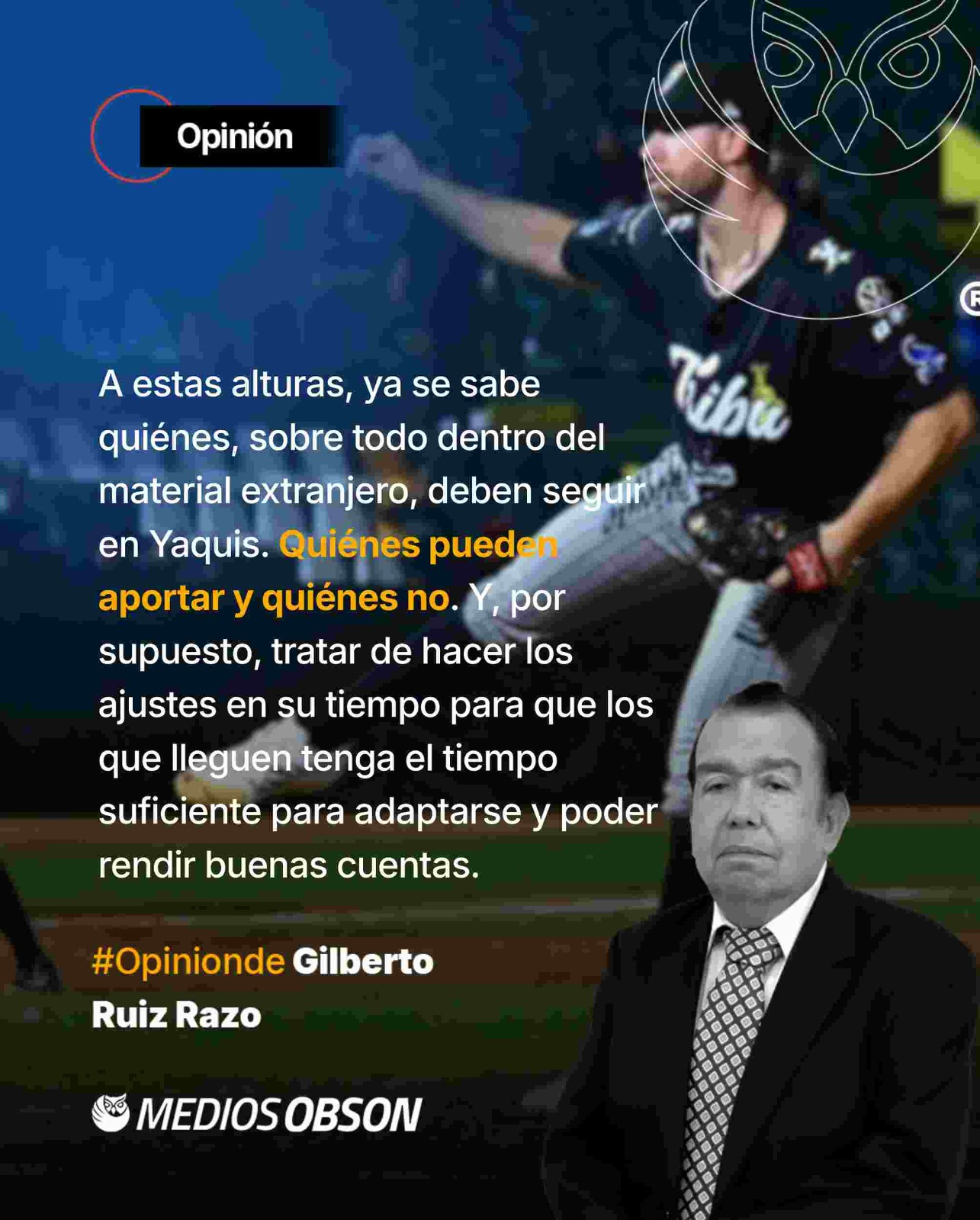 AJUSTES.- A estas alturas, ya se sabe quiénes, sobre todo dentro del material extranjero, deben seguir en el equipo. Quiénes pueden aportar y quiénes no. Y, por supuesto, tratar de hacer los ajustes en su tiempo para que los que lleguen en el último mes de temporada regular, tenga el tiempo suficiente para adaptarse y poder rendir buenas cuentas. Es decir, no deben, los directivos de la tribu de Cajeme, dormirse en sus laureles.