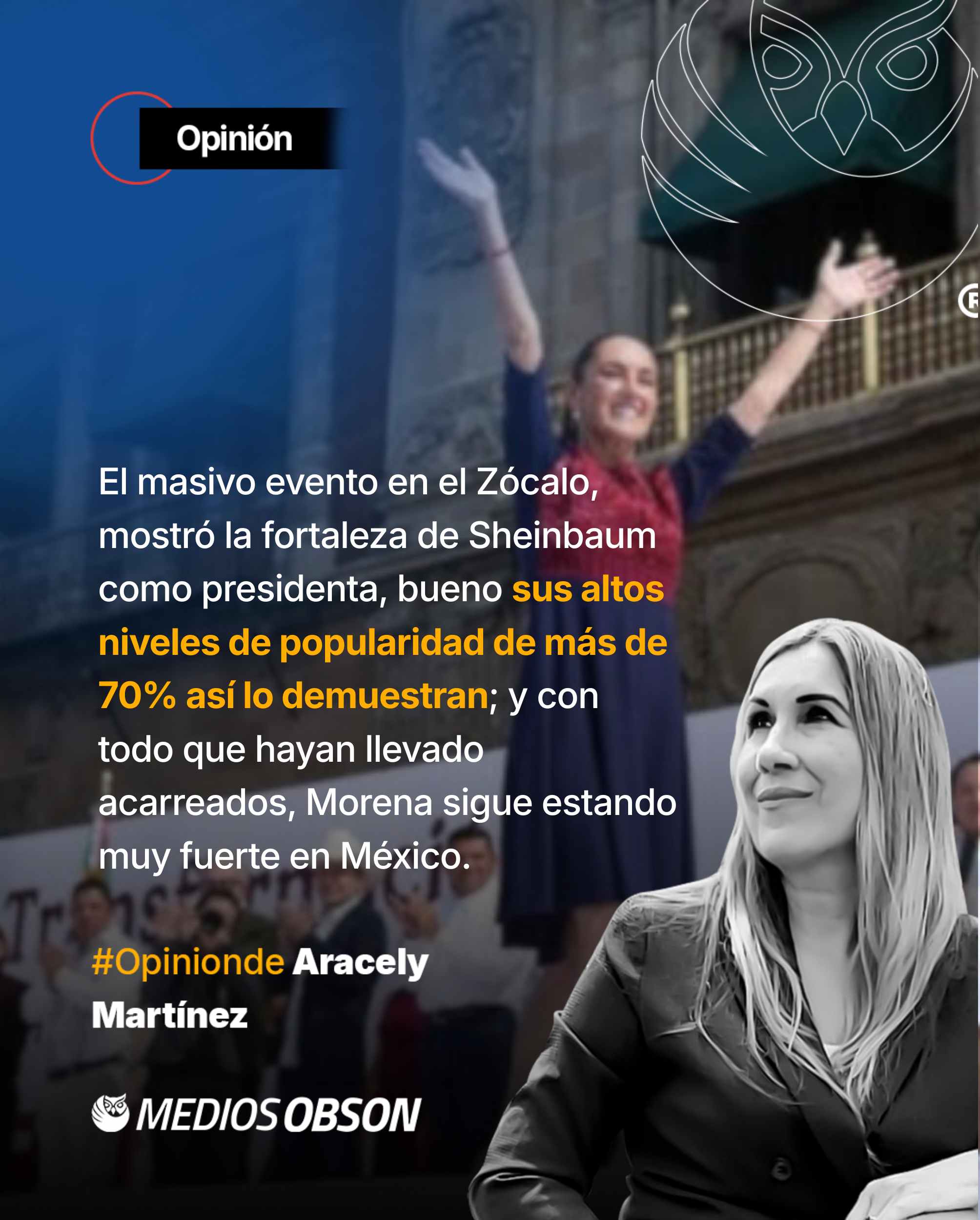 El masivo evento en el Zócalo, mostró la fortaleza de Sheinbaum como presidenta, bueno sus altos niveles de popularidad de más de 70% así lo demuestran; y con todo que hayan llevado acarreados, Morena sigue estando muy fuerte en México. La oposición sigue perdida, tropezando de tumbo en tumbo, sin dar una. Para bien de la propia Morena, y de México, no se diga, necesitamos, una oposición inteligente, pero con esos voceros que se mandan, dan pena ajena.