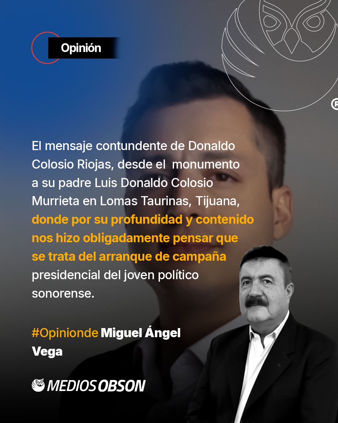 Escuchamos completo el mensaje tronante y contundente, además de franco y realista, del senador por Movimiento Ciudadano, LUIS DONALDO COLOSIO RIOJAS, desde el monumento a su padre LUIS DONALDO COLOSIO MURRIETA en Lomas Taurinas, Tijuana, donde su profundidad y contenido nos hizo obligadamente pensar que se trata del arranque de campaña presidencial del joven político sonorense, avecindado en Monterrey Nuevo León, de donde ya fue presidente municipal. Empezó diciendo que a su corta edad de ocho años escuchó por primera vez el nombre de ese lugar, de la forma más dolorosa que pudiera existir, porque ahí fue donde asesinaron a su padre, hace 27 años, el 23 de marzo de 1994, un día fatal de su vida. Externó que por el magnicidio se desmoronaron cientos de ilusiones en el México del futuro, de trabajo, de oportunidades, pero más allá de eso, esto fue un crudo ejemplo de cómo el odio y las ambiciones de la gente cobarde son capaces de asesinar a toda una nación. Después enumeró varios perdones, porque su padre le enseñó que el rencor y el odio envenenan el alma, empezando por perdonar a los cobardes que le arrebataron a su padre, haciendo hasta lo inimaginable con tal de sacar a Colosio de la contienda. Perdonó ahí mismo al asesino (MARIO ABURTO) que le quitó la vida, producto de circunstancias inciertas, inesperadas y posiblemente obligadas por las que atravesaba en aquel momento. Perdonó además a las instituciones políticas que lejos de honrar su legado, han usurpado el nombre de su padre y se han beneficiado de él para sus proyectos políticos vacíos. Perdonó también a un sistema judicial que lejos de ayudar a procurar la verdad, se empeñó en destruir toda posibilidad de hacer justicia a un crimen nacional. Perdona porque dice que es lo correcto y porque no existe una transición hacia la paz, sin un auténtico ejercicio de reconciliación. Pero fue enfático al mencionar que hay cosas que no perdona, ni perdonará nunca, como lo que a él y a su familia les sucedió, aunque de manera muy pública no es tan distinto a lo que le ocurre a miles de familias mexicanas todos los días y que viven ese sufrimiento en el completo olvido. Dijo no perdonar que en México tantas familias padezcan lo mismo que ha sufrido la suya por las ineficiencias e imprudencias (Ahí te hablan AMLO) de nuestro sistema de gobierno, por la pérdida de un padre, una madre, un hijo, un hermano o cualquier ser querido, víctimas de la violencia que azota nuestra tierra. O de un sistema de salud que tras décadas de descuido permite que se pierdan miles de vidas, al perder la esperanza de una atención digna y eficiente. Tampoco perdona y le ofende que tengamos en nuestra niñez un futuro incierto, en el principal propósito que siempre debe tener México, como lo es el abandono educativo y que ese rezago se traduzca en las enormes desigualdades sociales que vivimos todos los días. Tampoco dijo perdonar que nuestra clase política lejos de evolucionar, siga fomentando las viejas prácticas que secuestran el poder para servir a sus propios grupos e intereses perversos. No perdona mencionó también, que en momentos de crisis y devastación nacional no se escuchen llamados a la unidad y la solidaridad de parte de nuestros liderazgos. Porque todas y todos los que vivimos en este país tenemos la corresponsabilidad ciudadana de salir adelante y por ello nos vemos obligados a reconciliar a la nación con la nación. Y enseguida sin mencionarlo directamente dejó entrever sus intenciones de ahora sí lanzarse a la presidencia de la república, al decir que en la mirada de sus hijos reconoce la urgente necesidad de encarar hasta con su propia vida a un sistema, a una clase política, a una sociedad dividida, manifestando que el pasado incluyendo el suyo se debe de quedar en donde está y por eso aquí y ahora comienza una nueva y urgente historia para él y la pone a los pies de su país con todo lo que es, con todo lo que tiene y con todo lo que pueda aportar, porque esto ya se ha tornado en su propósito de vida, detonar el surgimiento de una generación nueva y diferente de liderazgos que con integridad y con congruencia se arrojen al servicio de nuestra gente. Pero también es urgente que nuestra gente despierte a una nueva realidad (Ojo chairos). En México dijo que se comparten espacios todos dentro de un mismo barco y por más diferencias e intereses que distingan a las personas de esta tierra somos todos partícipes del destino mexicano y por ende somos responsables del rumbo que tome nuestra patria. O remamos todos parejos para el mismo lado, o estaremos condenados a hundirnos todos por igual. Por eso dijo que da este primer paso y espera que su gente lo tome también con él. Y finalizó además de dar las gracias a su padre LDCM y su madre DIANA LAURA RIOJAS, invitando a todo México a estar unido, para salir adelante. Si todo este contenido, no es el arranque de una campaña presidencial, entonces alguien nos explique de qué se trata. Y es que no debemos olvidar que en la pasada contienda presidencial el joven Colosio llegó a mencionarse como aspirante a la primera magistratura del país e incluso hubo activismo político en varias regiones del país, tendiente a tales propósitos, pero a decir verdad al entonces alcalde de Monterrey nunca lo miramos decidido y se supo que, entre otros factores, no se decidió por su corta edad, sin embargo, a la próximo contienda presidencial que estamos más que seguros que la acaba de arrancar llegará en su madurez óptima para hacerle frente a esa altísima responsabilidad, porque si él tenía ocho años cuando mataron a su padre y de eso hace 27 años, entonces actualmente tiene 35 años y a esos agréguele que faltarían cinco para que acceda al sillón principal de palacio nacional, entonces estaría llegando a los 40 años, que ni es tan joven porque ya contaría con la experiencia necesaria, ni es tan viejo para que le faltara energí