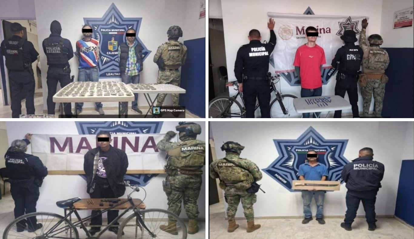 La Secretaría de Seguridad Pública Municipal, en coordinación con personal de la Secretaría de Marina y Policía Estatal, logró la detención de cinco personas durante distintos operativos mixtos realizados en diversas colonias del municipio de Cajeme, como parte de las acciones permanentes de prevención y combate al delito.