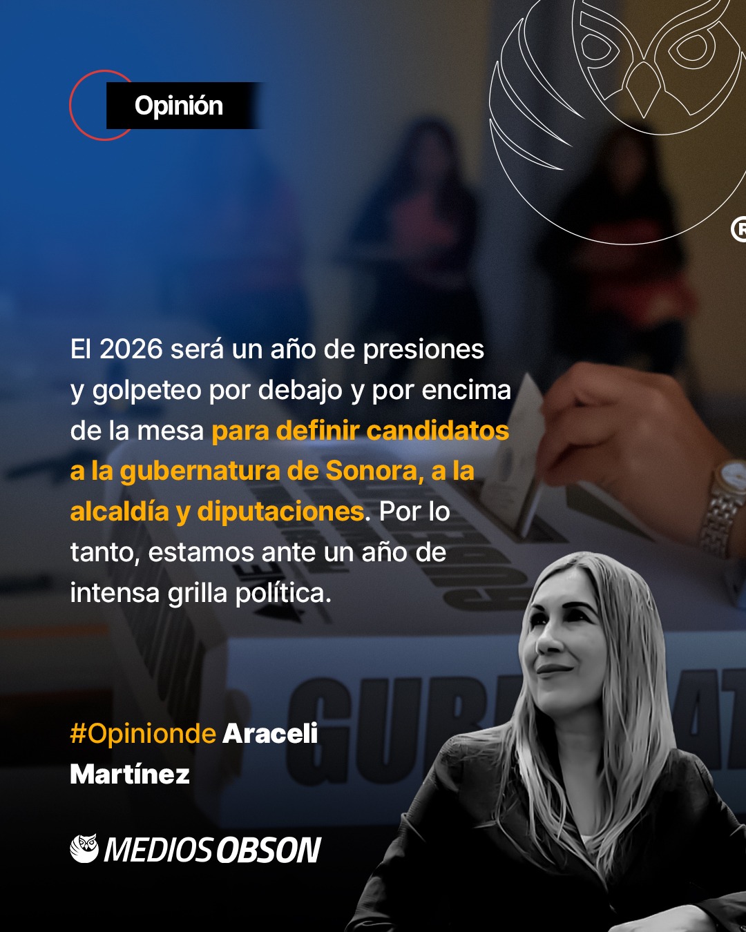 El 2026 será un año de presiones y golpeteo por debajo y por encima de la mesa para definir candidatos a la gubernatura de Sonora, a la alcaldía y diputaciones. Por lo tanto, estamos ante un año de intensa grilla política.