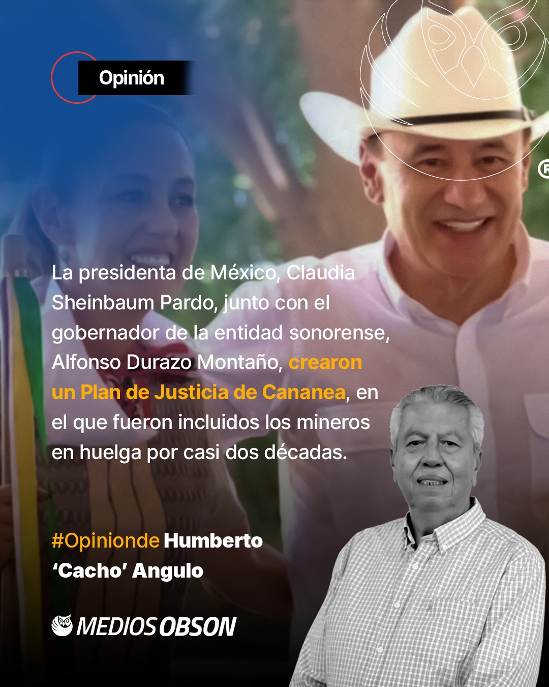 La presidenta de México, CLAUDIA SHEINBAUM PARDO, junto con el gobernador de la entidad sonorense ALFONSO DURAZO MONTAÑO, crearon un plan de justicia de Cananea, en el que fueron incluidos los mineros en huelga por casi dos décadas. Dicho Plan de Justicia de Cananea, fue creado con un fondo de dos mil doscientos veintidós millones de pesos, con una aportación de 700 millones del gobierno federal y 1,500 millones de parte de la empresa minera del grupo México, y el resto aportados por recursos del gobierno del estado, esto es 182 millones de pesos. Dicho plan consiste en el tratamiento de las aguas de dos ríos, pues el 16 de agosto del 2014, hubo un accidente ecológico y ambiental generado por una fuga de las tuberías de las instalaciones del grupo México, que derivó en la contaminación de los ríos Sonora y Bacanuchi, con 40 mil metros cúbicos de contaminantes altamente tóxicos.