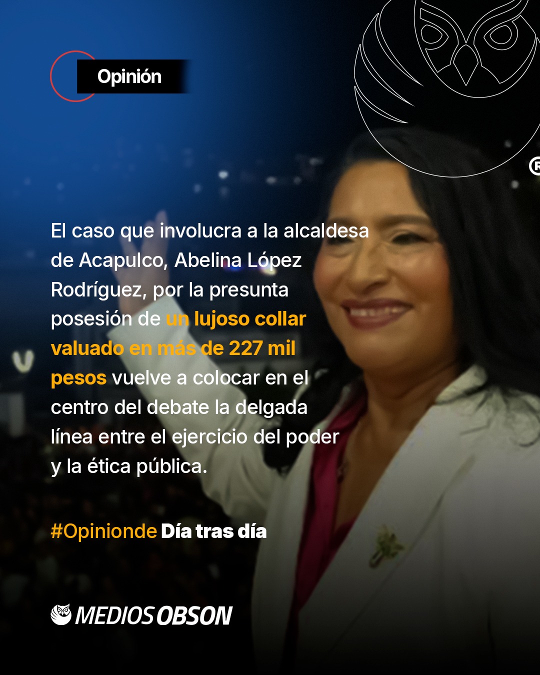 El caso que involucra a la alcaldesa de Acapulco, Abelina López Rodríguez, por la presunta posesión de un lujoso collar valuado en más de 227 mil pesos vuelve a colocar en el centro del debate la delgada línea entre el ejercicio del poder y la ética pública. Más allá de si la pieza de la marca Van Cleef & Arpels fue comprada o recibida como ‘regalo’, como declaró la propia edil, el fondo del asunto radica en la responsabilidad que implica ser servidora pública y en la obligación de conducirse con austeridad, transparencia y congruencia. La apertura de una carpeta de investigación por parte de la Fiscalía Especializada en Combate a la Corrupción de Guerrero por el posible delito de cohecho no es un hecho menor, sobre todo cuando el Código Penal es claro al señalar que cualquier dádiva recibida por un funcionario puede constituir una falta grave. Este episodio se suma a un historial de señalamientos que incluyen presuntas irregularidades por 898 millones de pesos, intentos de censura y acusaciones de abuso de poder, lo que debilita aún más la confianza ciudadana en su administración. En un contexto nacional donde el discurso oficial insiste en la honestidad y la austeridad como principios rectores, los actos y declaraciones de figuras como Abelina López Rodríguez no solo son un asunto personal, sino un reflejo del compromiso real con la rendición de cuentas y el respeto a la legalidad.