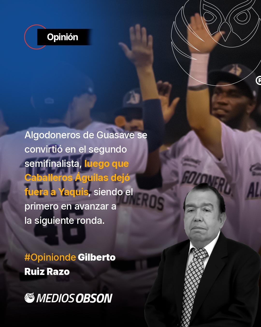 AVANZAN.- Algodoneros de Guasave se convirtió en el segundo semifinalista, luego que Caballeros Águilas dejó fuera a Yaquis, siendo el primero en avanzar a la siguiente ronda. Los fronterizos lo hicieron en cuatro juegos, mientras los dirigidos por Oscar Robles necesitaron cinco juegos para lograr el primer objetivo.