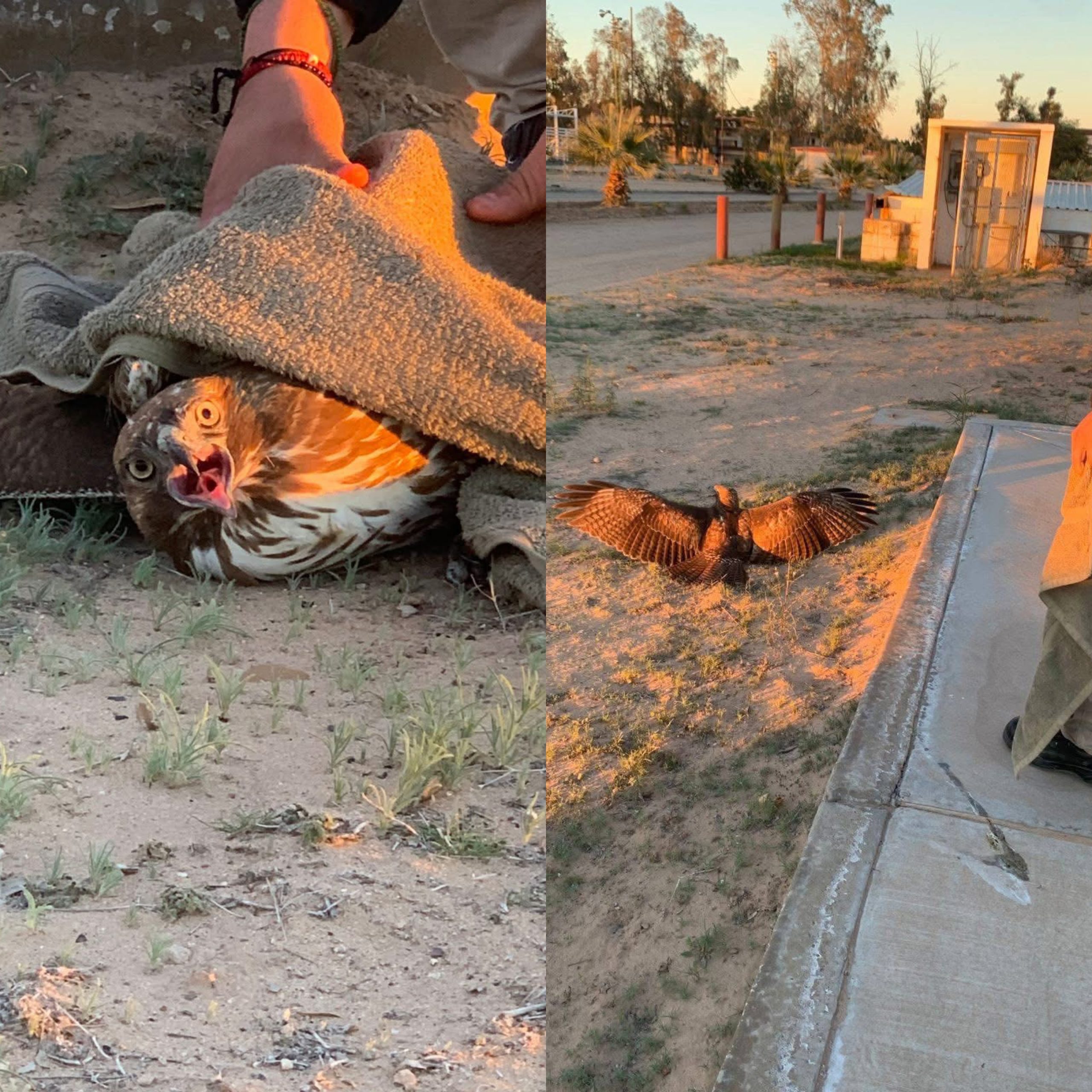 Elementos del Cuerpo de Bomberos Voluntarios de San Luis Río Colorado rescatarán y resguardarán a un águila real que presentaba lesiones tras una caída, en las inmediaciones de la Universidad Estatal de Sonora (UES).