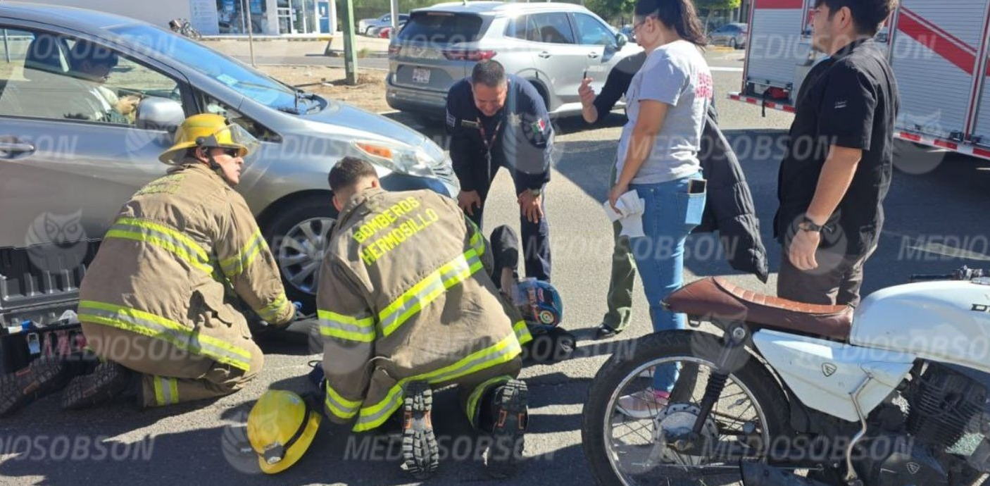 Hermosillo, Sonora.— Una mujer con siete meses de embarazo resultó lesionada la tarde de este martes, tras un choque entre un automóvil tipo sedán y una motocicleta, ocurrido en el cruce del bulevar Morelos y la calle Ley Federal del Trabajo, al norte de Hermosillo.