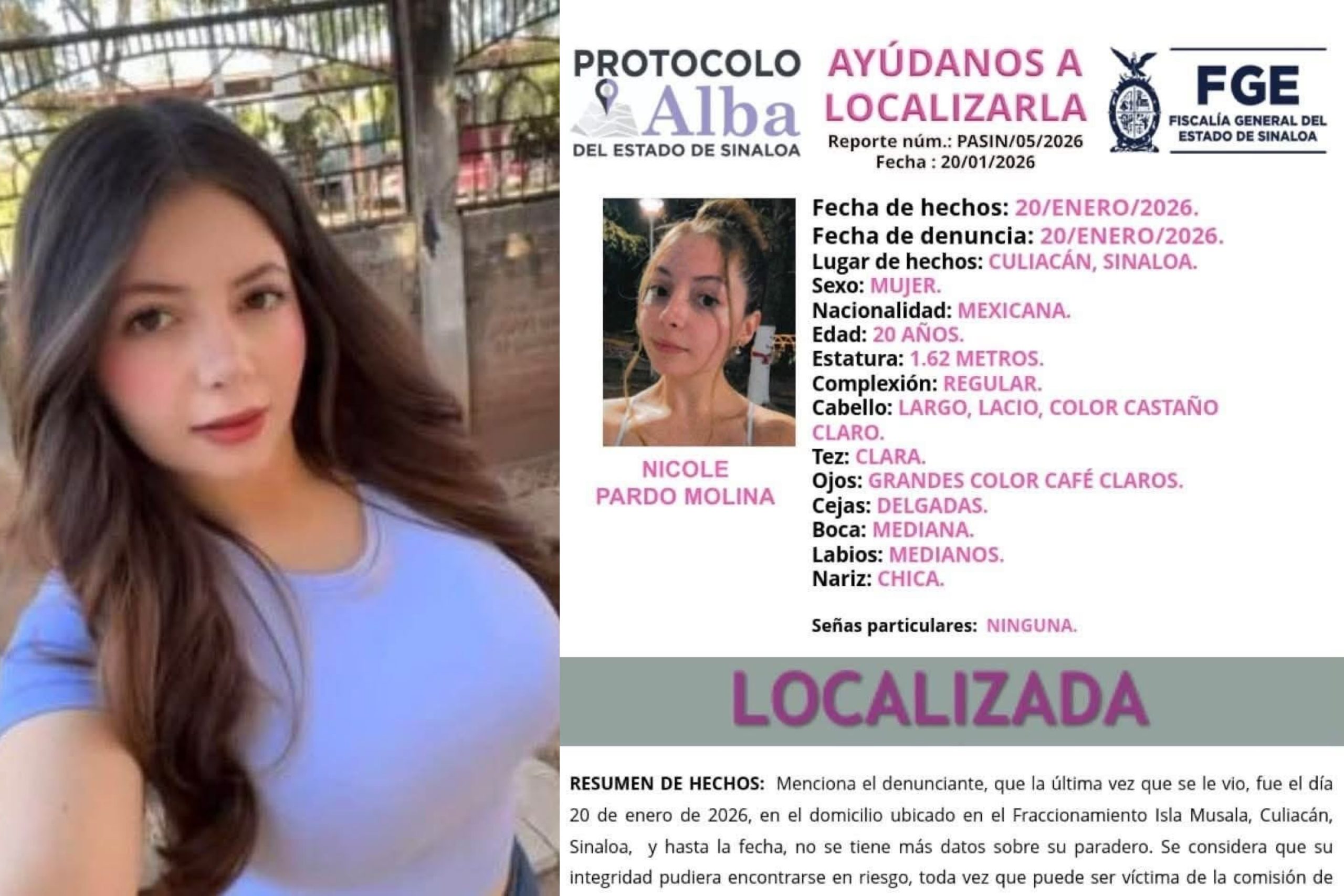La Fiscalía General del Estado de Sinaloa (FGE) dio a conocer la localización con vida de la influencer Nicole Pardo, conocida en redes sociales como “La Nicholette”, lo que permitió la desactivación del Protocolo Alba que se encontraba vigente tras su desaparición.