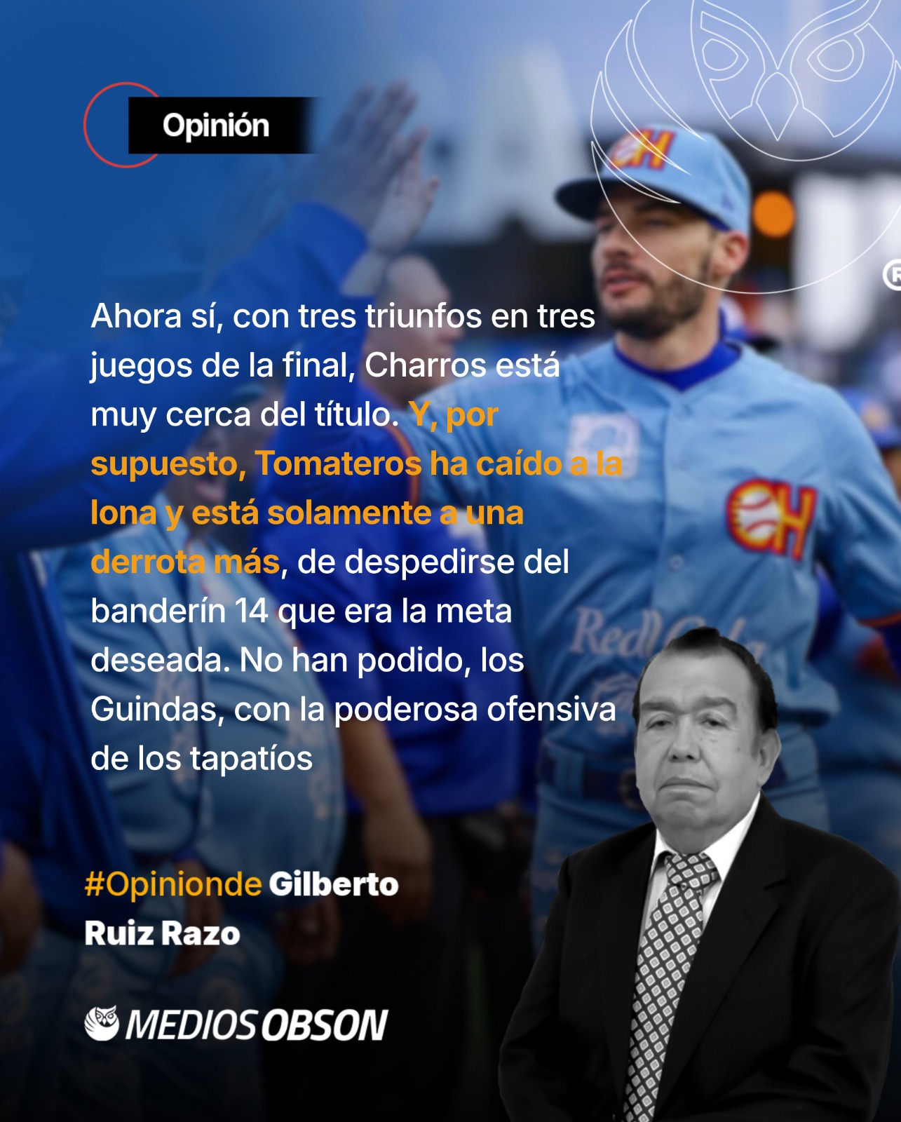 IGUAL.- Todos sabemos que en el beisbol, como en otros deportes, se gana y se pierde. Hasta el momento, todo parece indicar que Charros se adjudicar el cuarto título en su corta historia de 12 temporadas. No se va a terminar el mundo porque Tomateros fracase y no consiga su título número 14. Han tenido la dicha de saborear muchas veces un banderín. En caso de no lograr la hazaña de ligar cuatro triunfos, deberán conformarse con un estupendo segundo lugar.