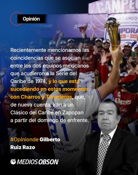 LAS COINCIDENCIAS.- Recientemente mencionamos las coincidencias que se asocian entre los dos equipos mexicanos que acudieron a la Serie dl Caribe de 1974 (Venados y Yaquis) cuando se celebró por vez primera un evento así en nuestro país (Hermosillo) y lo que está sucediendo en estos momentos con Charros y Tomateros, que, de nueva cuenta, irán a un Clásico del Caribe en Zapopan a partir del domingo de enfrente.