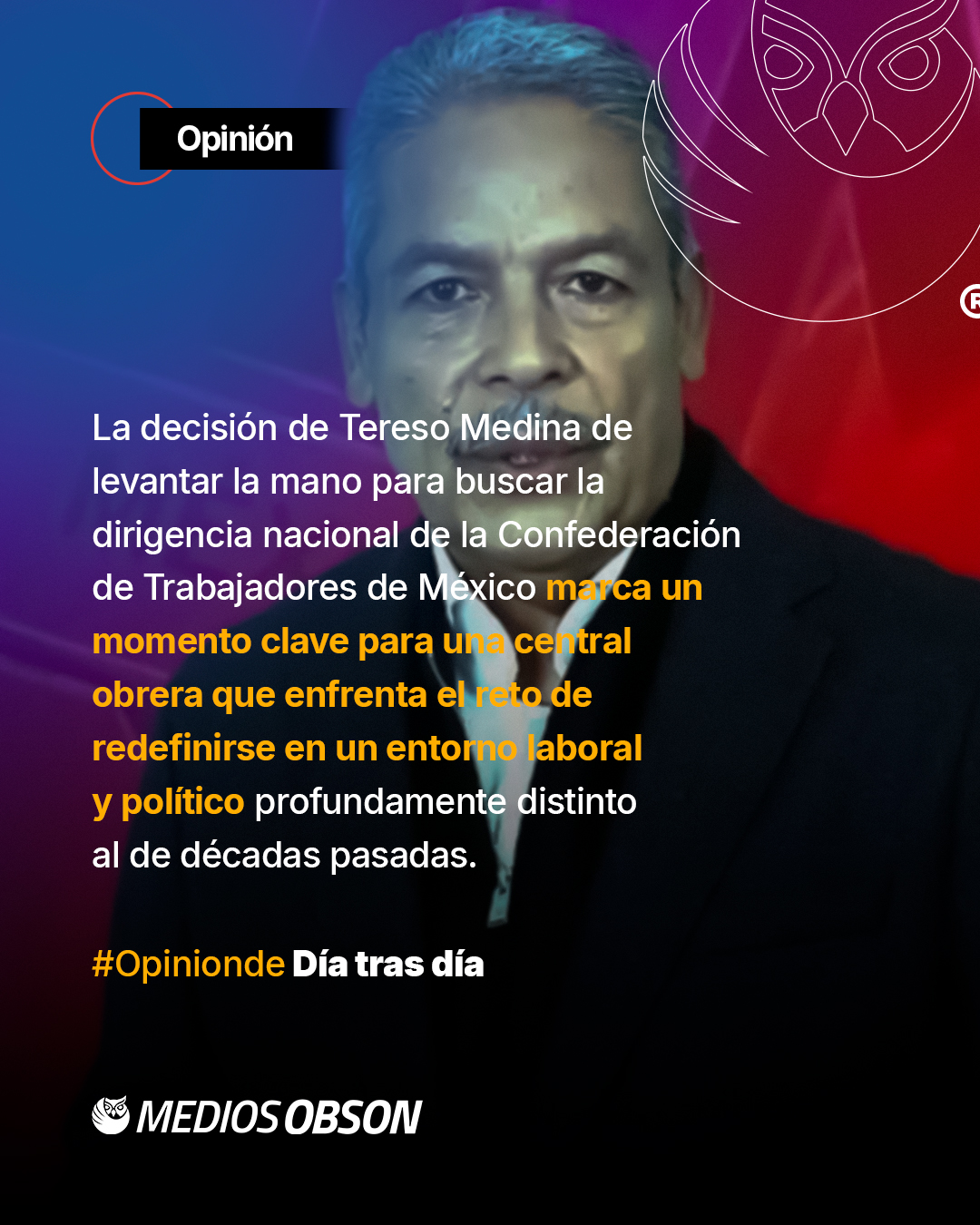 La decisión de Tereso Medina de levantar la mano para buscar la dirigencia nacional de la Confederación de Trabajadores de México marca un momento clave para una central obrera que enfrenta el reto de redefinirse en un entorno laboral y político profundamente distinto al de décadas pasadas, pues tras el anuncio de Carlos Aceves del Olmo de no buscar la reelección, la CTM entra a una etapa de transición que pondrá a prueba su capacidad de unidad y adaptación; Medina, con larga trayectoria sindical y política, apuesta a un discurso de cohesión interna, respeto estatutario y defensa de los derechos de las y los trabajadores, una narrativa que resulta necesaria en un contexto donde el sindicalismo tradicional ha perdido presencia frente a nuevas formas de organización laboral y reformas que han modificado las reglas del juego, sin embargo, el desafío no será menor, ya que no basta con llamar a la unidad si no se acompaña de una agenda clara que reconecte a la CTM con las bases, con los jóvenes trabajadores y con los sectores productivos emergentes; el proceso que se avecina rumbo al 17º Congreso General Ordinario será determinante para saber si la Confederación logra una renovación real o si se limita a un relevo de nombres, porque más allá de quién encabece la dirigencia, lo que está en juego es la vigencia de la CTM como actor relevante en la defensa del trabajo organizado en México.