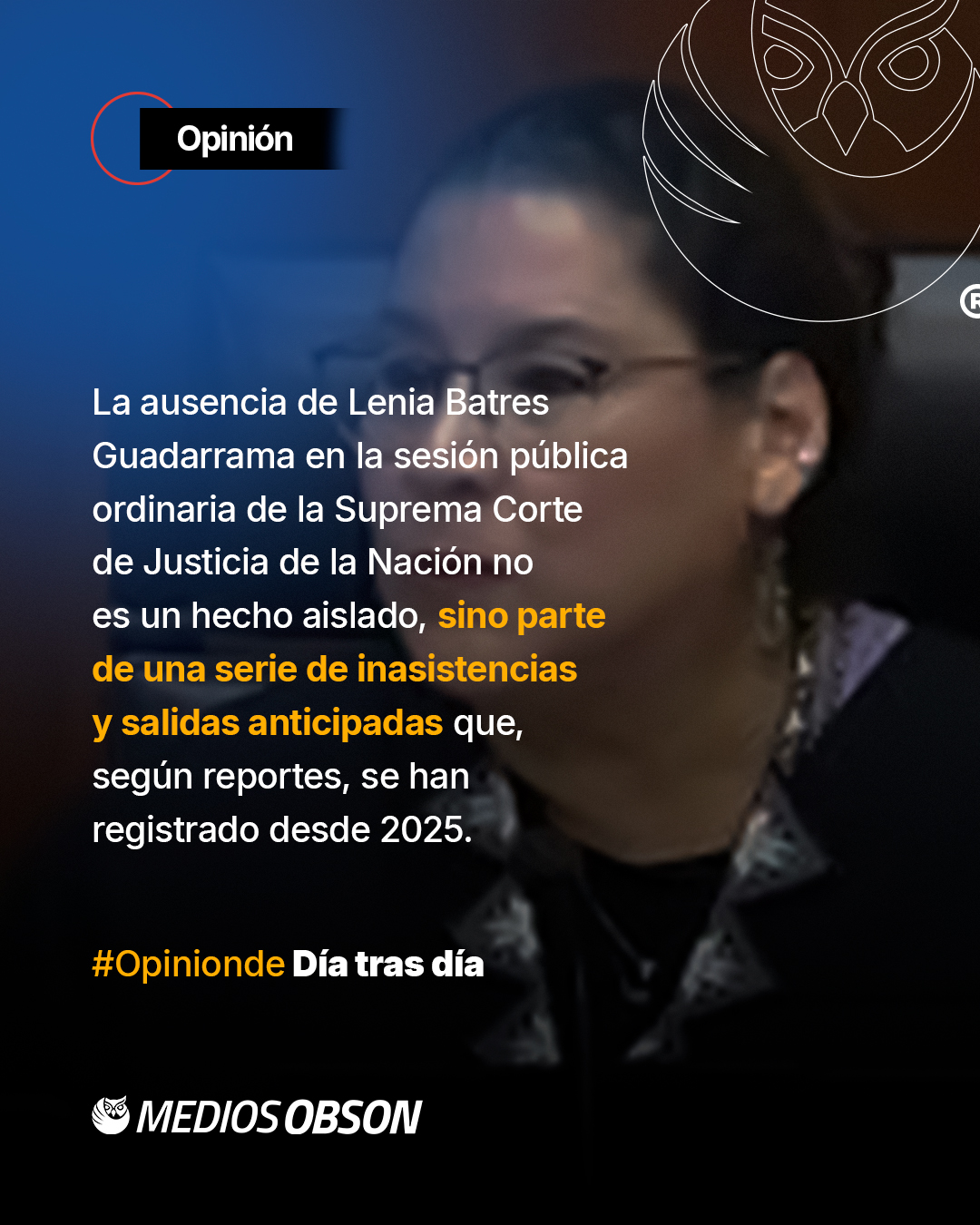 La ausencia de Lenia Batres Guadarrama en la sesión pública ordinaria de la Suprema Corte de Justicia de la Nación no es un hecho aislado, sino parte de una serie de inasistencias y salidas anticipadas que, según reportes, se han registrado desde 2025. En un órgano colegiado donde cada voto incide directamente en la resolución de amparos y controversias constitucionales, la presencia de sus integrantes no es un asunto menor, sino una responsabilidad institucional. La coincidencia de esta inasistencia con la difusión de encuestas que la colocan como la ministra con mayor desaprobación pública añade un componente político que inevitablemente influye en la percepción ciudadana. Sin embargo, más allá de simpatías o críticas, lo que está en juego es la credibilidad del máximo tribunal del país. La Corte requiere estabilidad, profesionalismo y compromiso constante para sostener su legitimidad. Cuando las ausencias se vuelven recurrentes, el debate deja de ser personal y se convierte en institucional. La rendición de cuentas y la transparencia sobre los motivos de estas inasistencias serían un paso necesario para evitar que la discusión pública erosione aún más la confianza en la justicia constitucional.