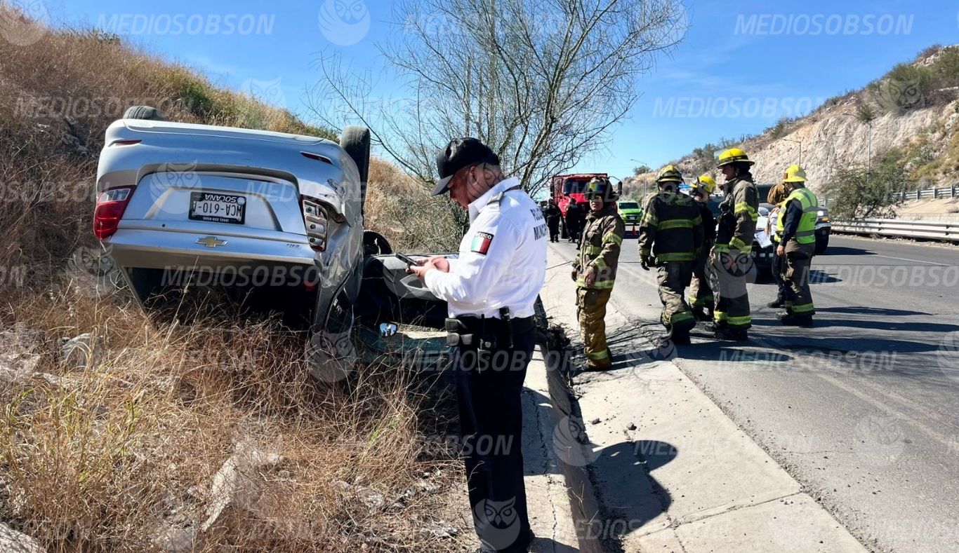 El accidente ocurrió alrededor de las 10:45 horas en el cruce del bulevar De los Ganaderos y Prolongación Paseo Río Sonora, en la zona de Nuevo Hermosillo, donde un automóvil Chevrolet Beat, modelo 2020, color plata, terminó con las llantas hacia arriba tras perder el control.