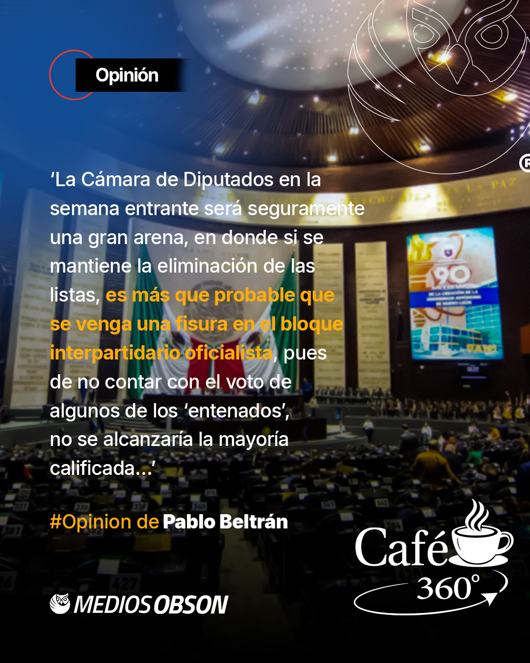 La cámara de diputados en la semana entrante será seguramente una gran arena, en donde si se mantiene la eliminación de las listas, es mas que probable que se venga una fisura en el bloque interpartidario oficialista, ya que de no contar con el voto de algunos de los ‘entenados’, no se alcanzaría la mayoría calificada para lograr la reforma constitucional, lo que daría al traste con la intentona, pero además marcaría la ruta de 2027 en las elecciones intermedias.