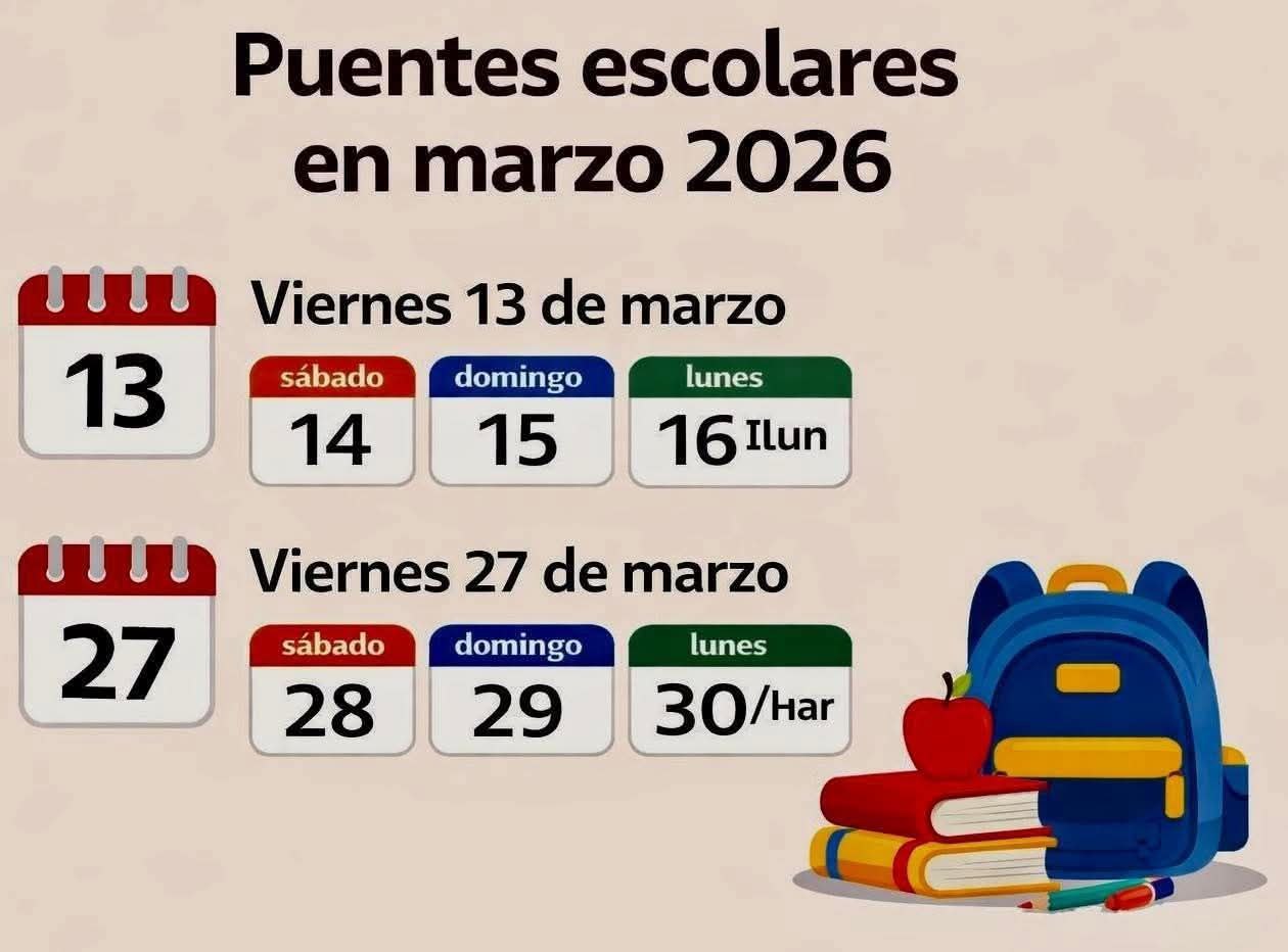 Según el calendario escolar 2025-2026, el primer descanso será el viernes 13 de marzo, fecha destinada al registro de calificaciones, por lo que estudiantes de preescolar, primaria y secundaria no acudirán a las aulas. Al juntarse con el sábado 14 y domingo 15, se forma el primer “puente” del mes.